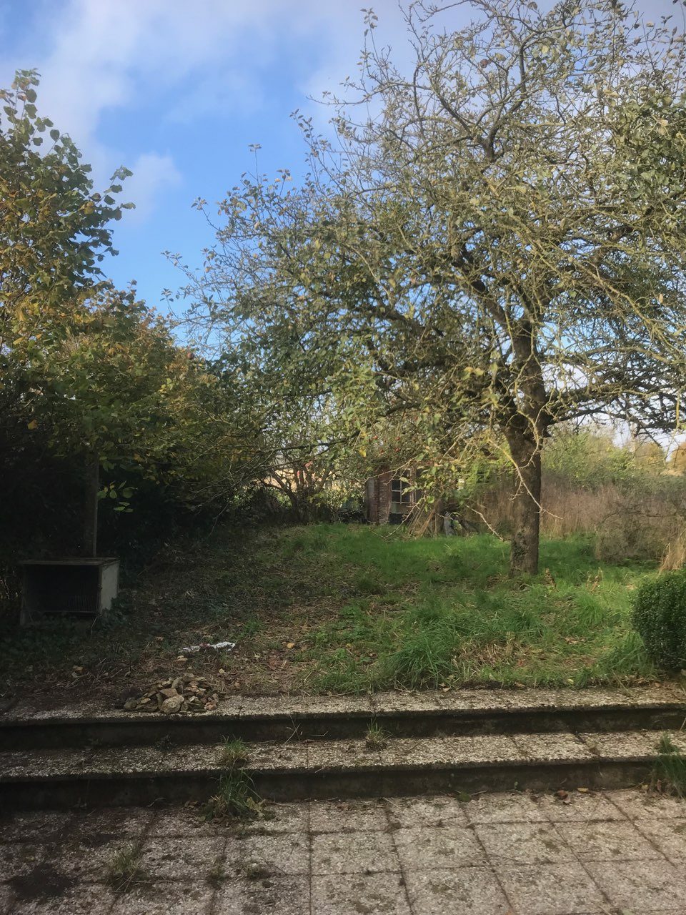 Terrasse en pavé à l'arrière de la maison, terrain avec pommiers et chalet.