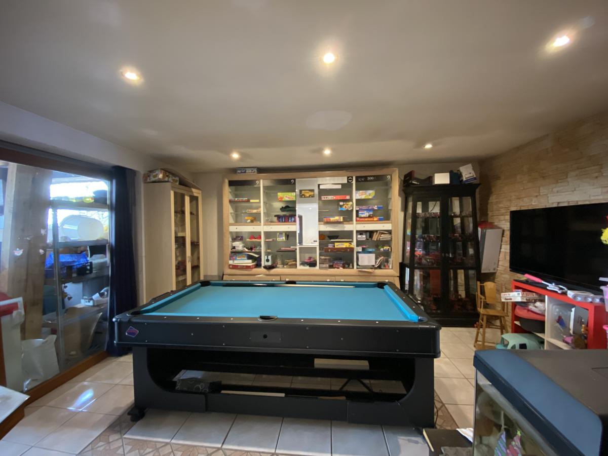 La maison offre au rez-de-chaussée une entrée desservant une belle cuisine contemporaine aménagée avec espace salle à manger, un salon ouvrant sur la terrasse (et la piscine), une salle de jeux/billard (ou chambre), une salle de bains, un WC indépendant ainsi qu’une buanderie. Un rangement sous escalier équipé d’un système d’aspiration centralisée complète ce niveau.