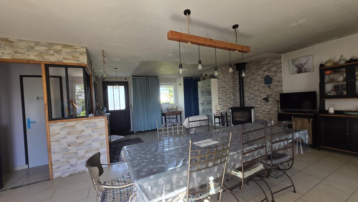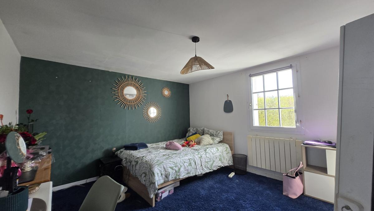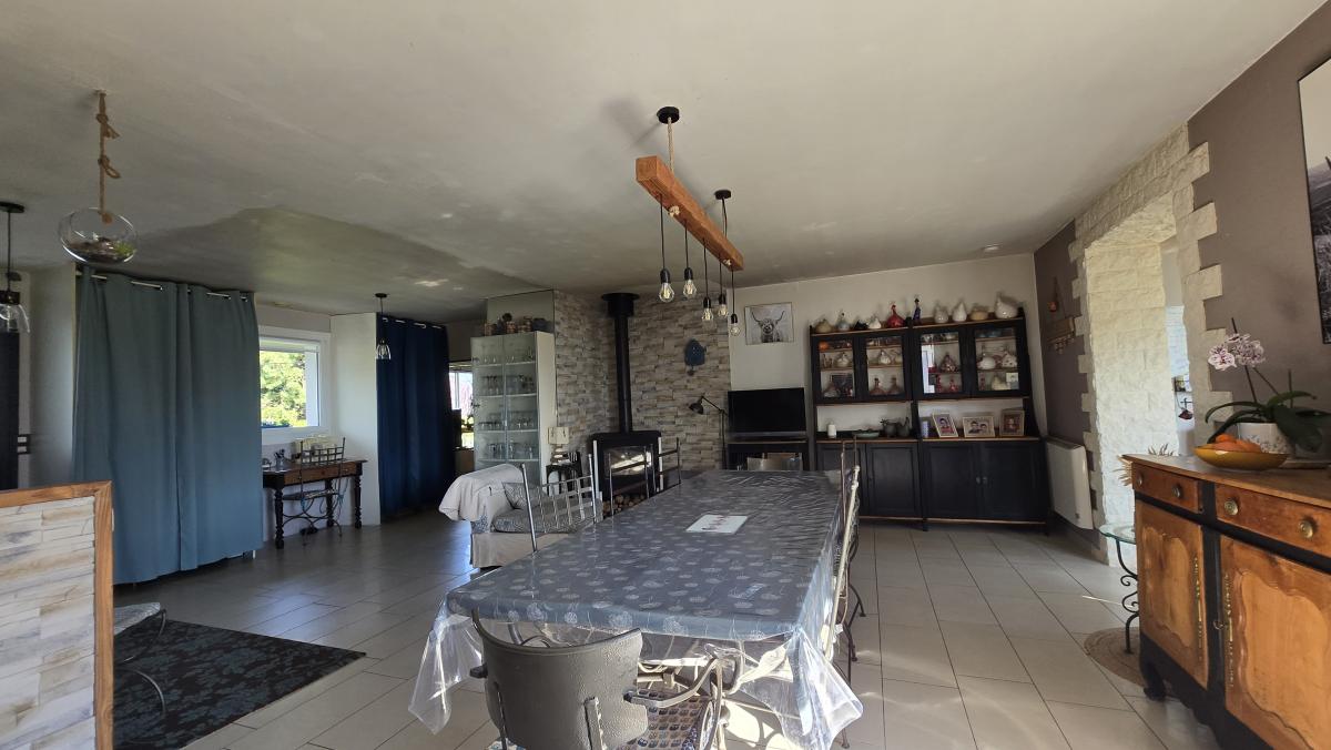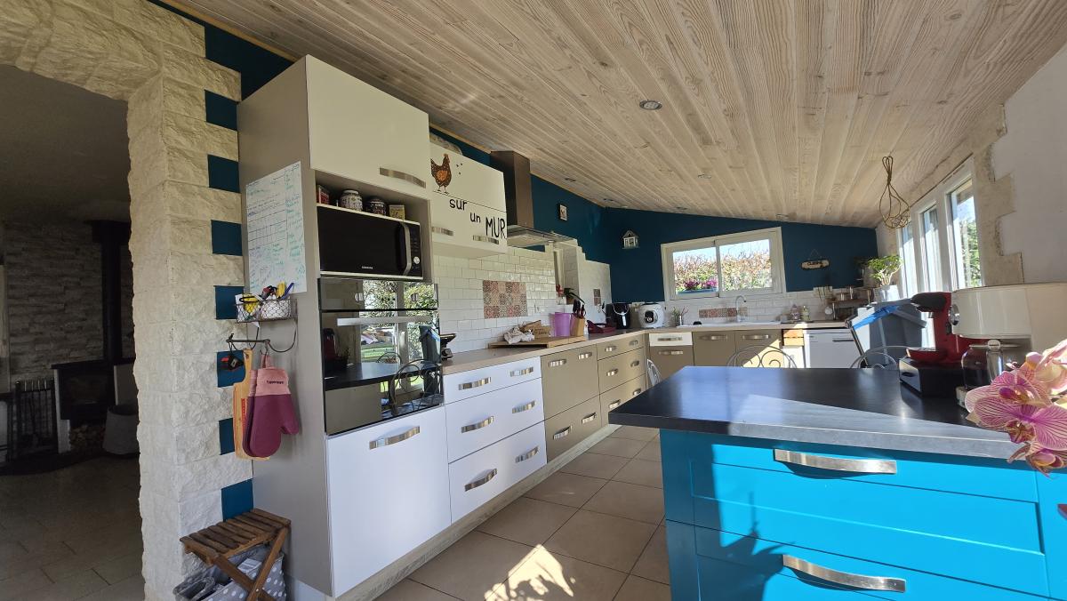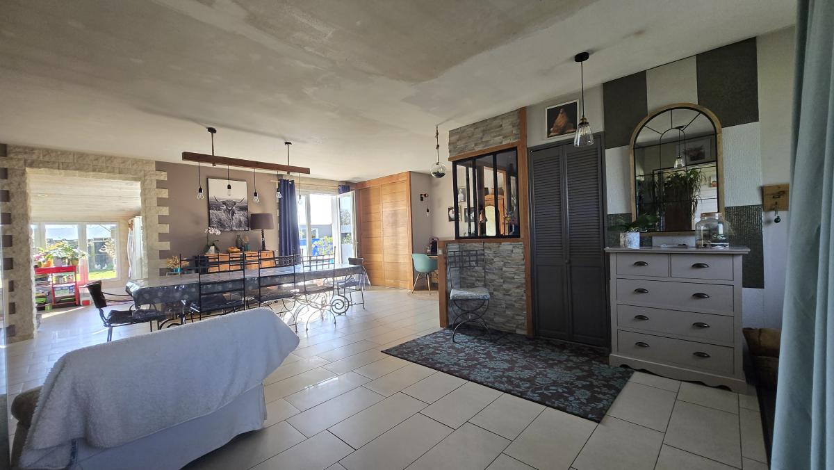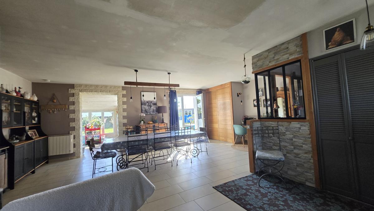 Une entrée sur vaste un séjour d'environ 45 m², une cuisine aménagée et équipée, dégagement, cinq chambres dont une avec salle de bain, une salle d'eau, un cellier, une buanderie, un bureau et wc