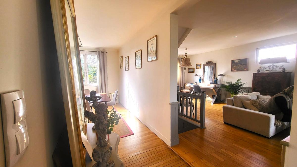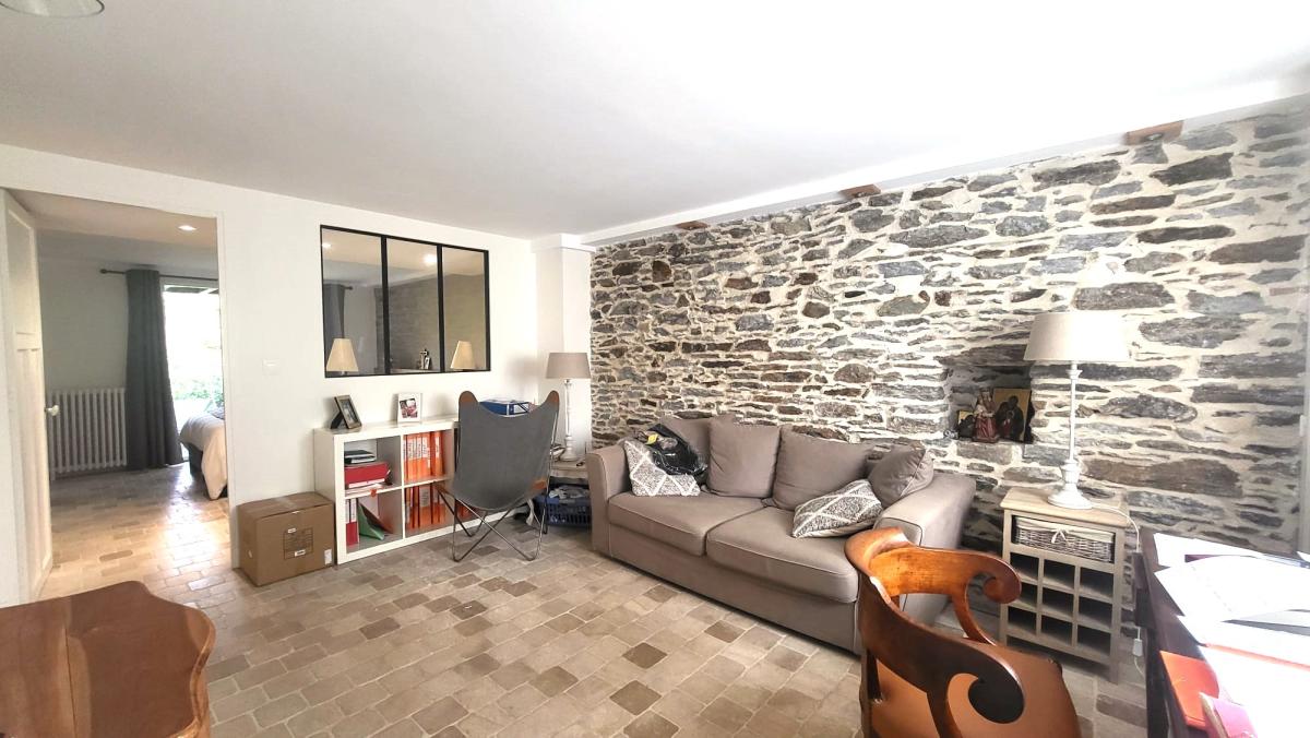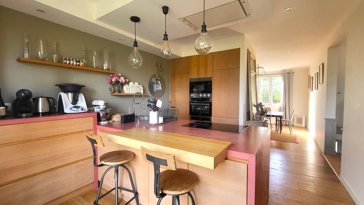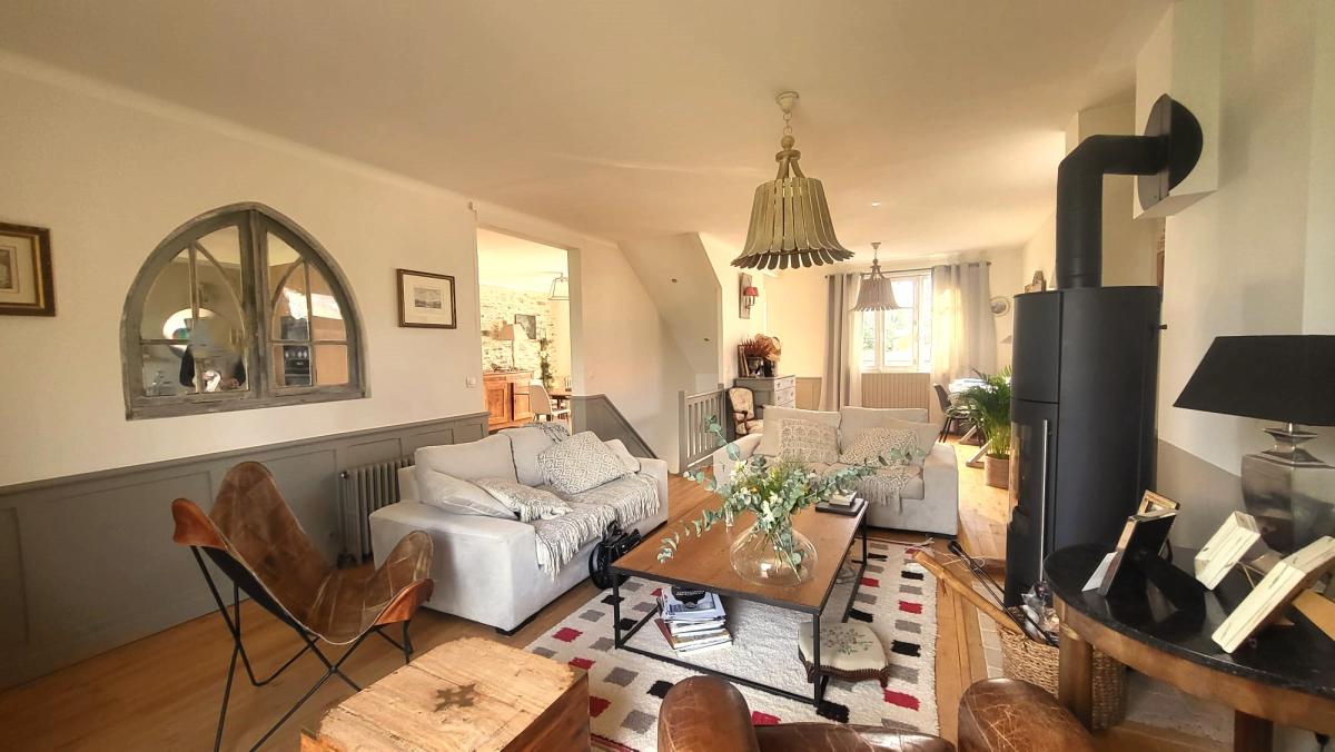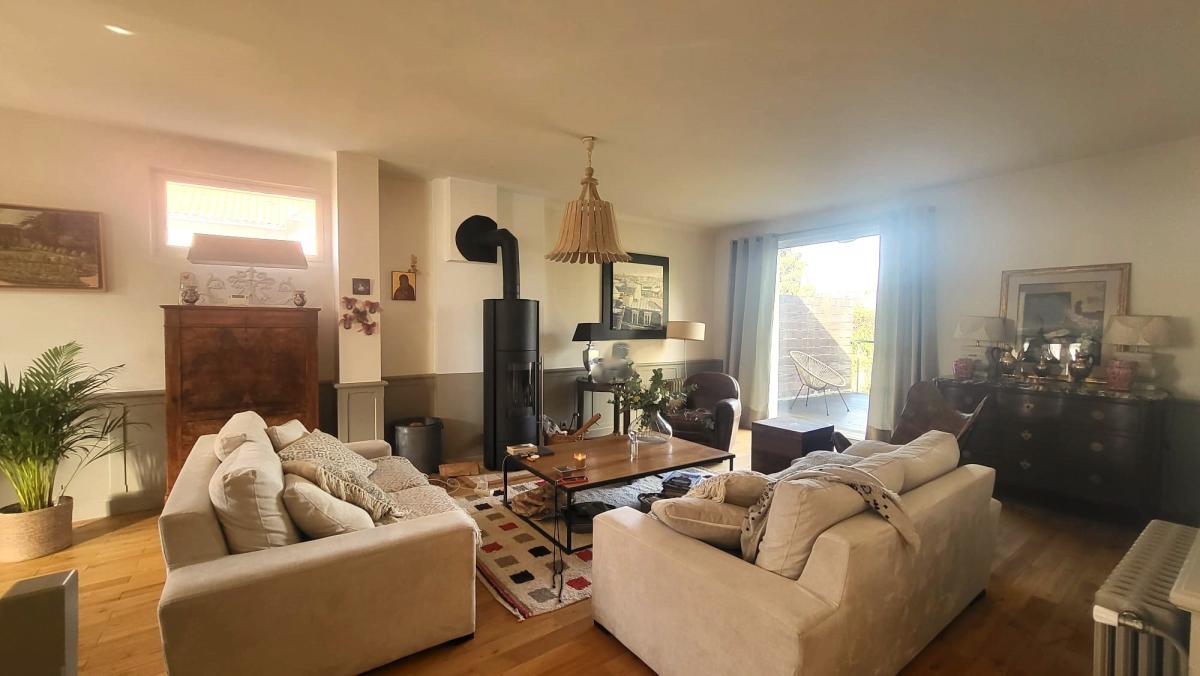 - Au premier étage, un magnifique espace de vie traversant baigné de lumière vous accueille. Il se compose d’un double salon d’environ 37 m² avec poêle, bénéficiant lui aussi d’un accès direct à la terrasse, d’une salle à manger de 14 m² pouvant facilement être transformée en chambre supplémentaire, ainsi que d’une cuisine aménagée et équipée ouverte sur la terrasse.