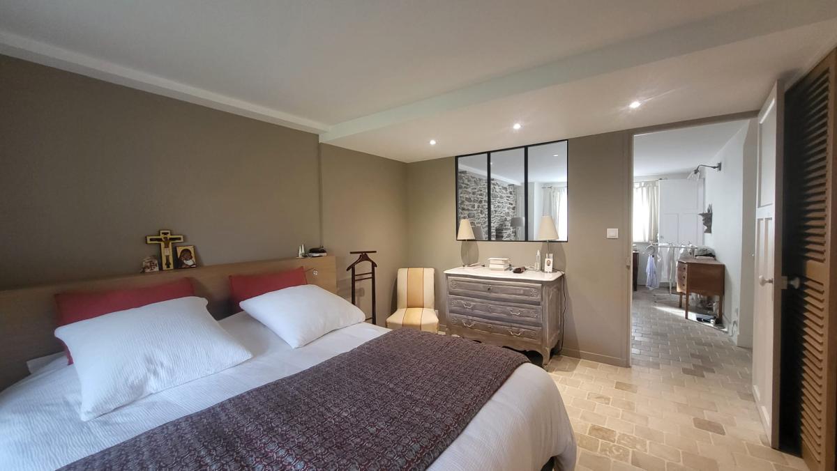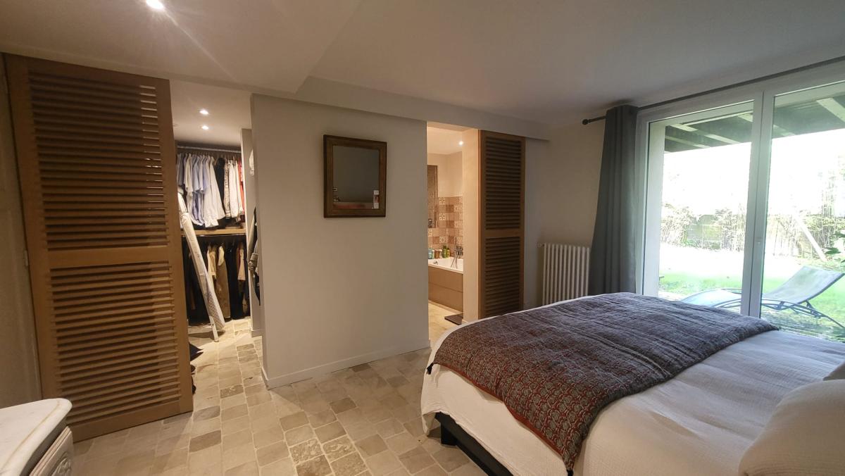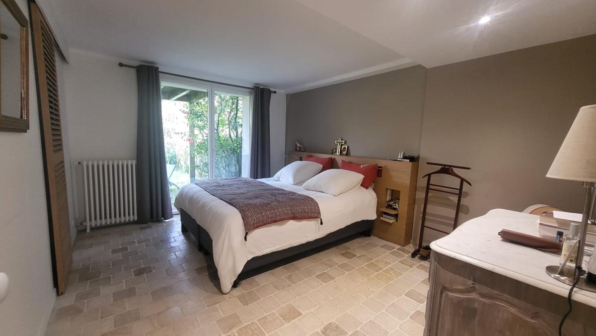 - Au rez-de-chaussée, vous trouverez une suite parentale d’environ 41 m² comprenant un vaste espace bureau, un dressing, une salle de bains avec douche supplémentaire ainsi qu’un WC avec lave-mains. L’ensemble est sublimé par un sol en pierre de Bourgogne et bénéficie d’un accès direct au jardin, offrant un espace intime et privilégié.