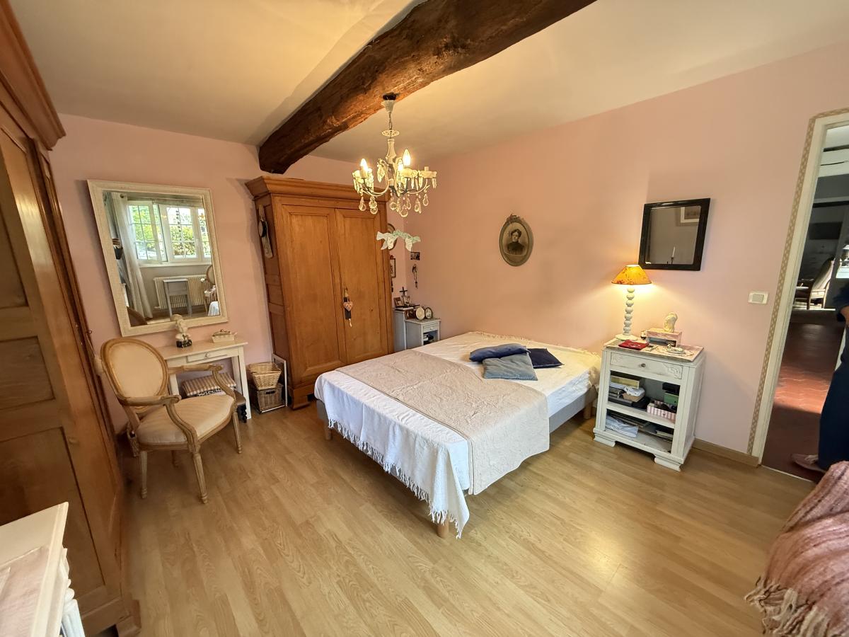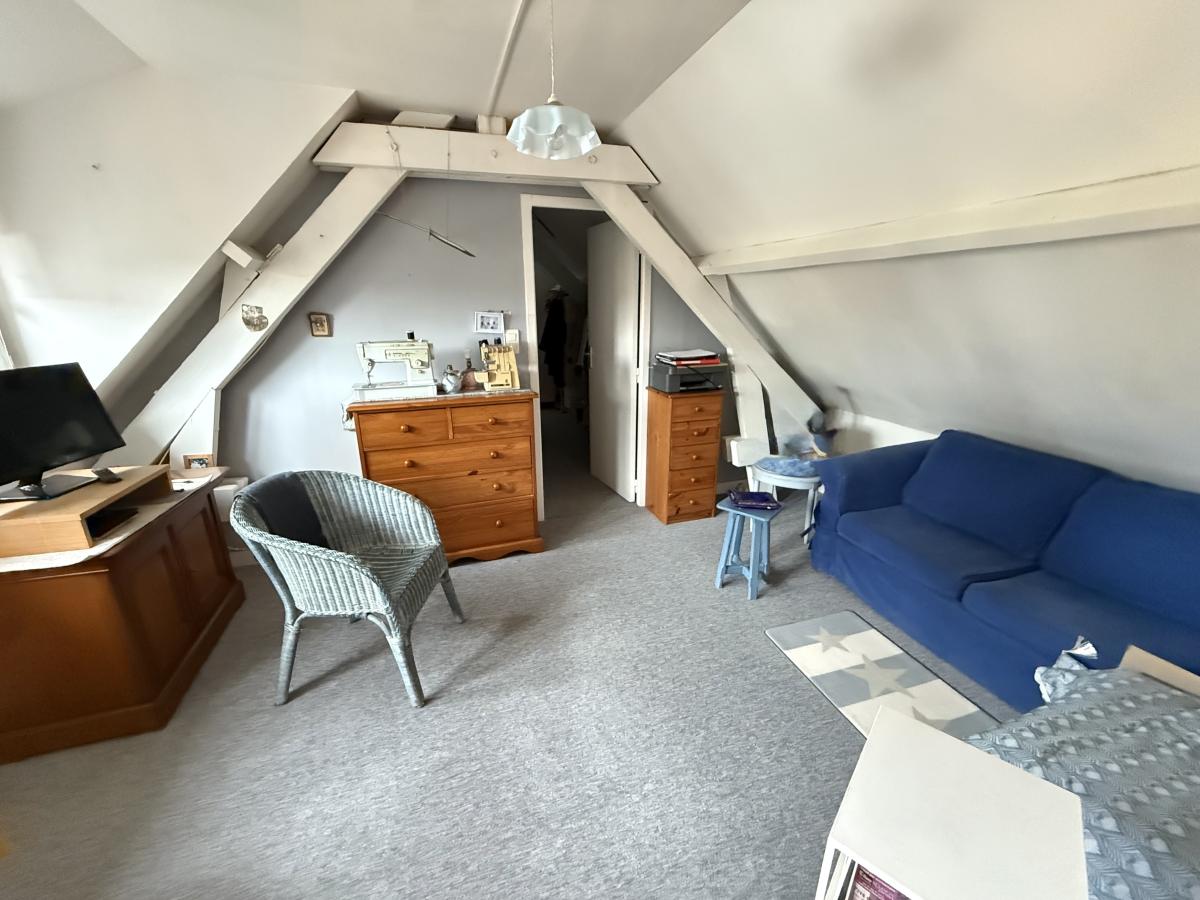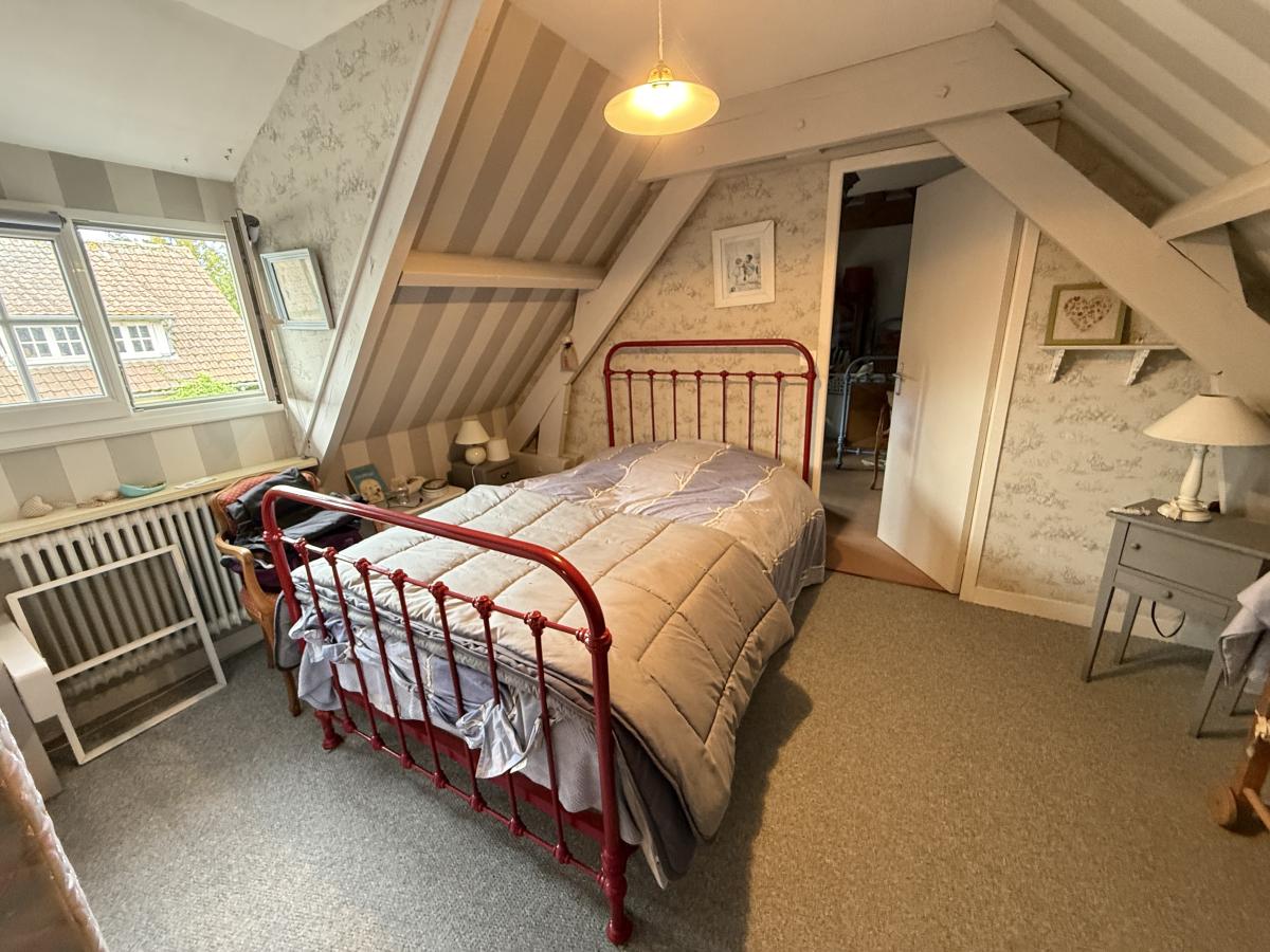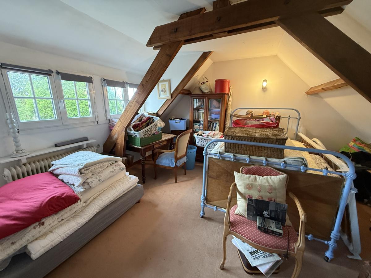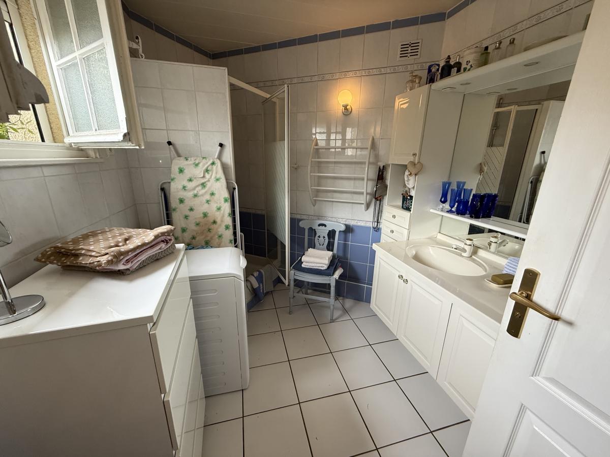 A l'étage un palier desservant deux chambres dont une passante, une salle de bains avec baignoire et vasque, WC de type sanibroyeur.