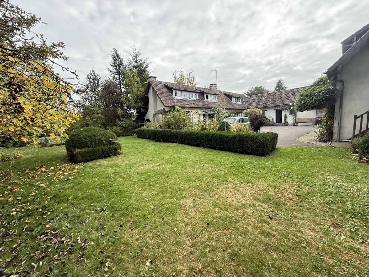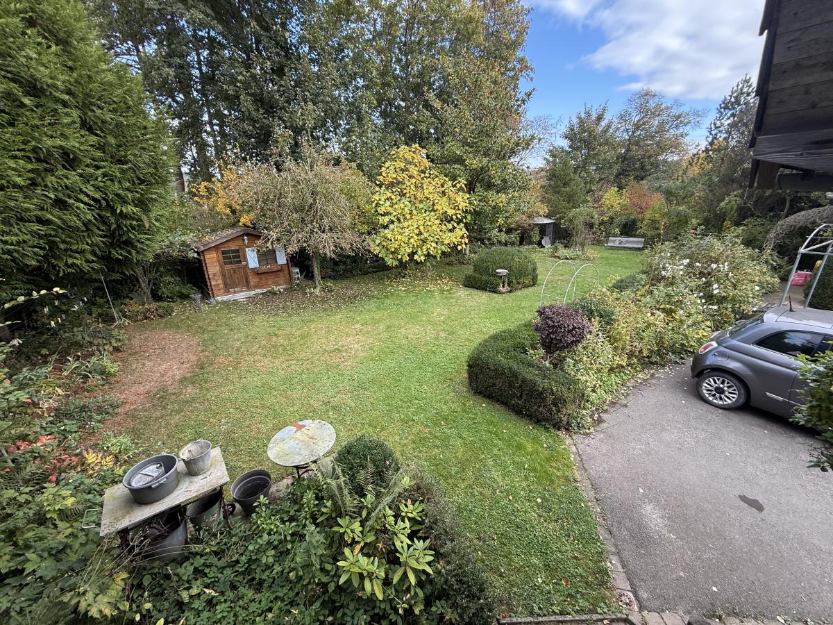 A l'extérieur un beau jardin arboré et clos sans vis à vis sur une parcelle d'environ 1217 m², une aire de stationnement en enrobés, un garage double d'environ 32 m², un espace de stockage avec un grenier potentiellement aménageable d'une surface d'environ 60 m², un chalet en bois le tout accessible par un portail motorisé.