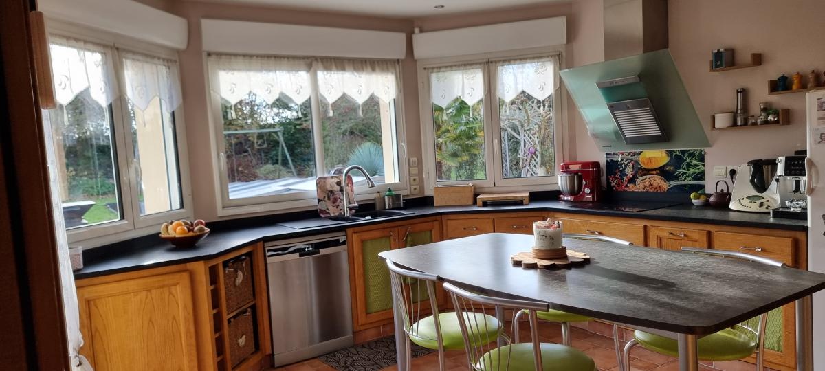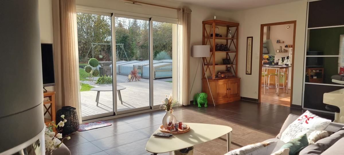Chauffage performant : plancher chauffant au rez-de-chaussée, radiateurs + poêle à bois, menuiseries PVC double vitrage.