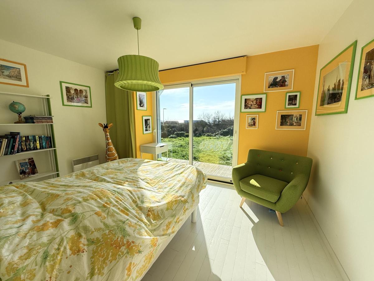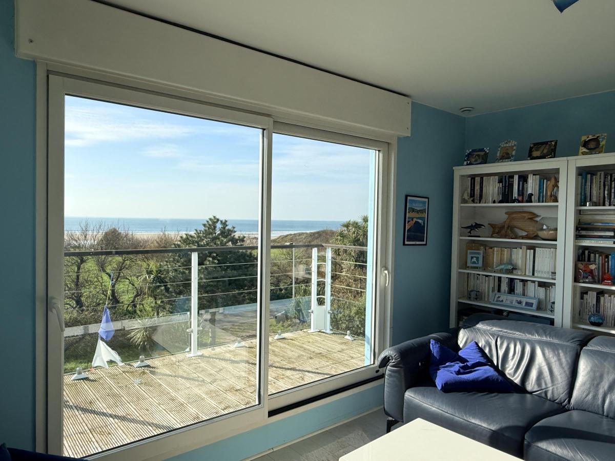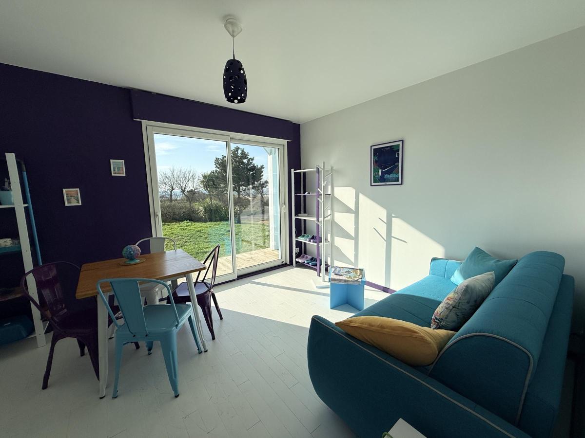 - à l'étage, offrant une vue imprenable sur la mer: le séjour-salon avec poêle à bois baigné de lumière grâce aux grandes baies inondant cet espace familial ouvert sur la cuisine et la salle à manger. Une cinquième chambre et une terrasse sur pilotis de laquelle la vue est à couper le souffle complètent ce niveau ! Autre WC à cet étage.