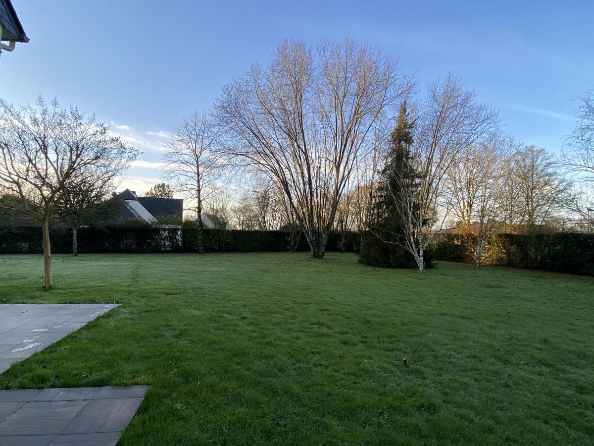 Double garage avec grenier au dessus, terrasse, cour aménagée, abri de jardin et terrain arboré et paysagé d'environ 1427 m².