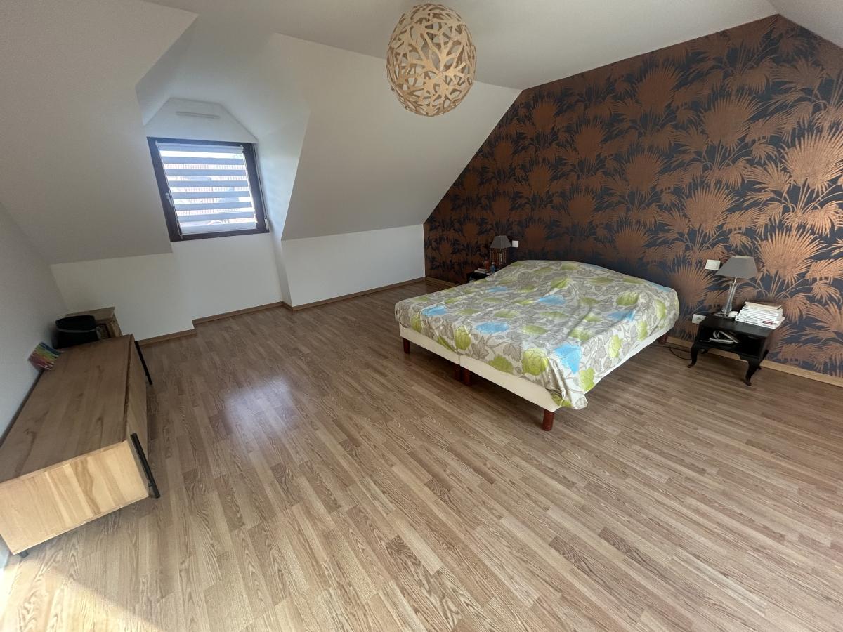 - Hall d'entrée avec vestiaire, vaste séjour très lumineux de 51m² avec cheminée feu de bois, cuisine ouverte équipée SCHMIDT avec espace repas de 20m², cellier de 7m², bureau (ou chambre) de 17m², wc avec lave-mains, dégagement.