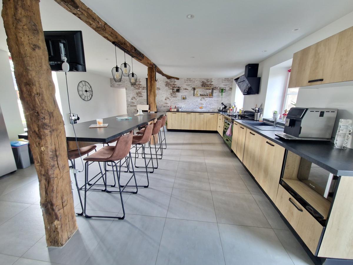 - rez-de-chaussée : salon avec sortie sur terrasse couverte, cuisine aménagée et équipée (piano, hotte) avec ilot central et poêle à granulés, chaufferie avec wc et lave-mains, salle à manger, lingerie/buanderie (possibilité de créer une chambre avec salle d'eau pour une vie de plain-pied 19 m2),