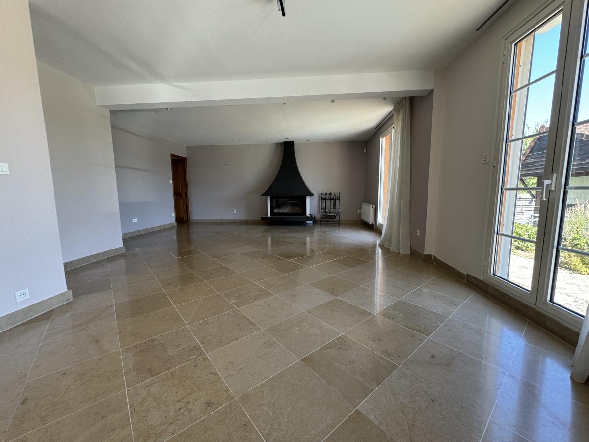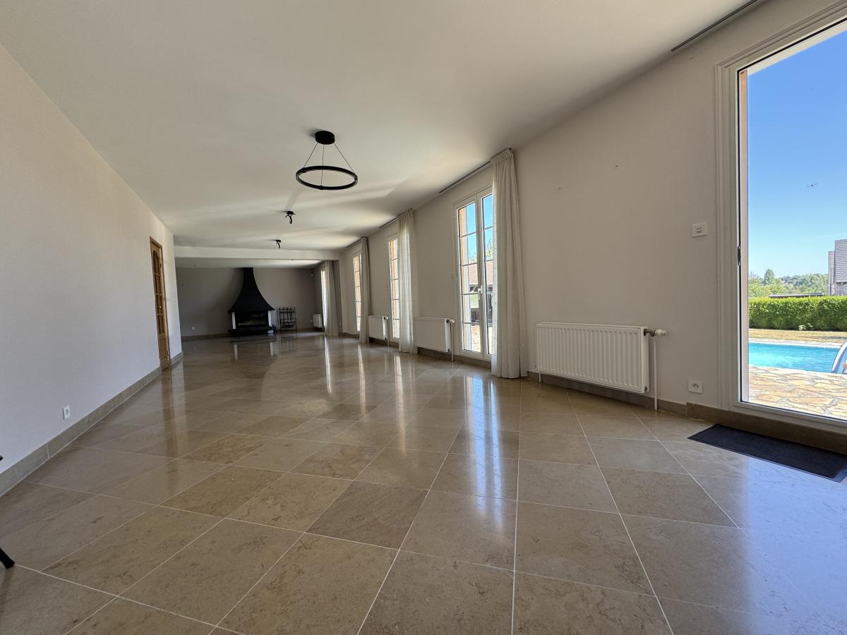 Au rez-de-chaussée : entrée avec vestiaire, wc, couloir (penderie), cuisine aménagée (bois) avec coin repas, grand séjour (env. 65 m²) donnant sur le terrain et la piscine, bureau (possible chambre), une grande chambre (anciennement 2 plus petites) et salle de bains avec baignoire.