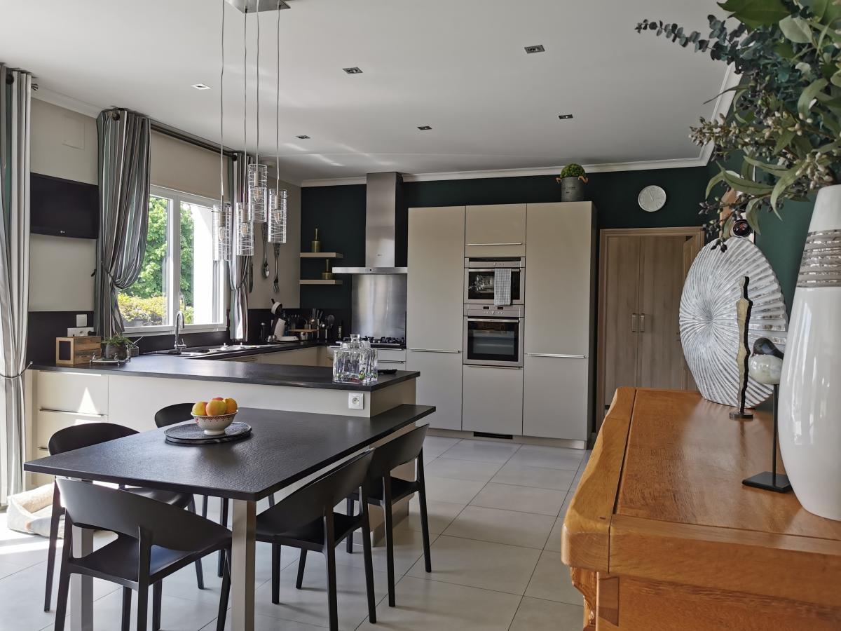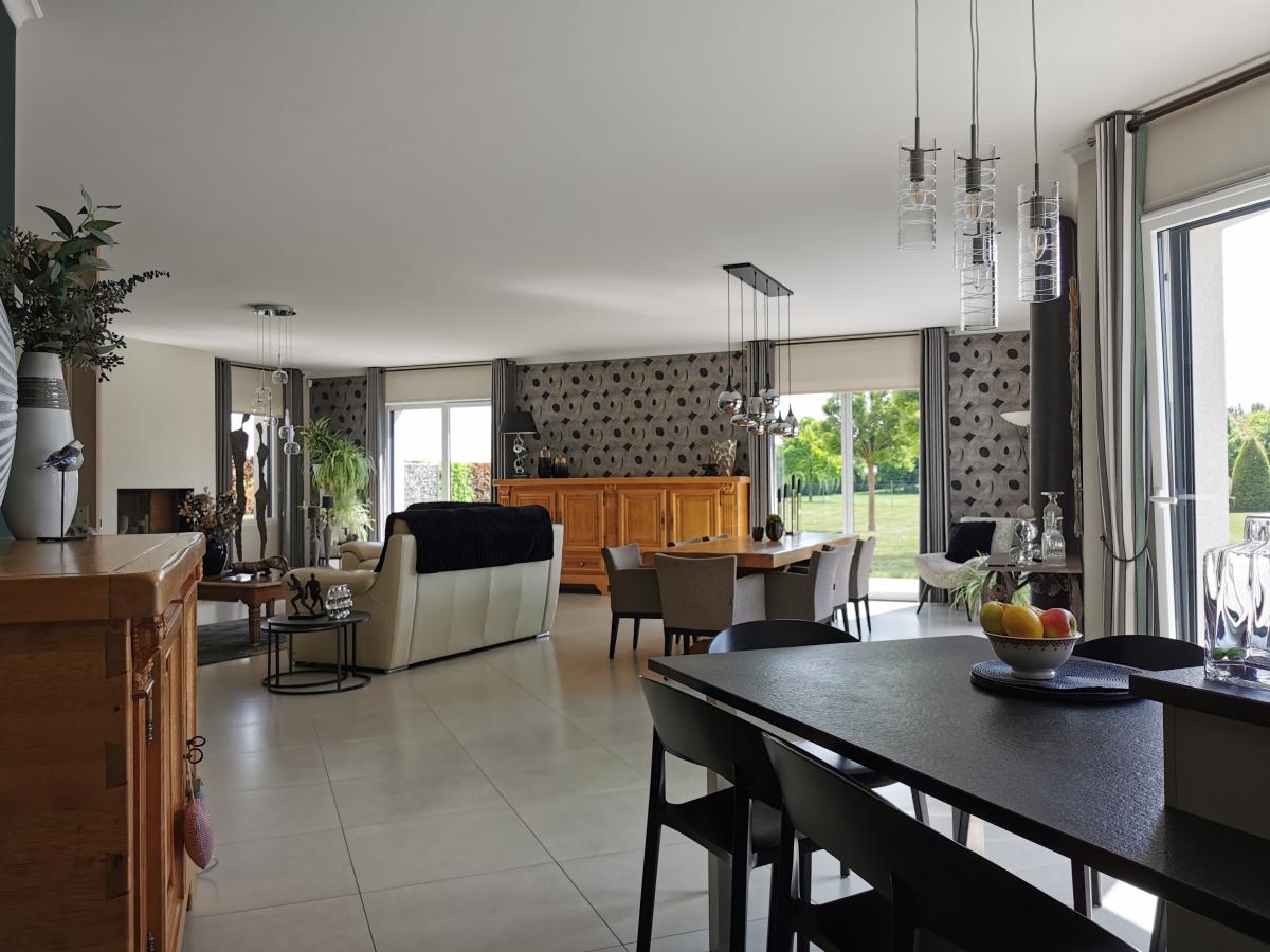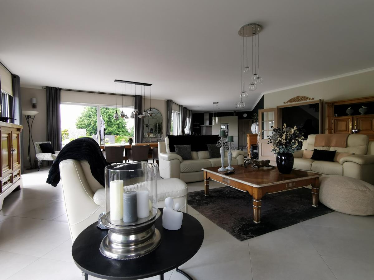 * salon-séjour baigné de lumière grâce à ses nombreuses baies vitrées (65,32 m²) ouvert sur cuisine parfaitement équipée (25,40 m²) ;
