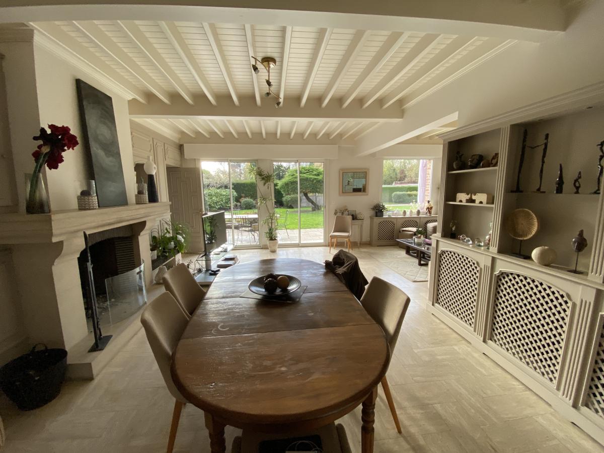 Le bien principal dispose de pièces de vie au rez de chaussée, comprenant un salon/ séjour avec cheminée ( 42m²) donnant sur le jardin, une grande pièce pouvant faire office de salle de jeux ( 50m²), une cuisine équipée et une salle à manger attenante.