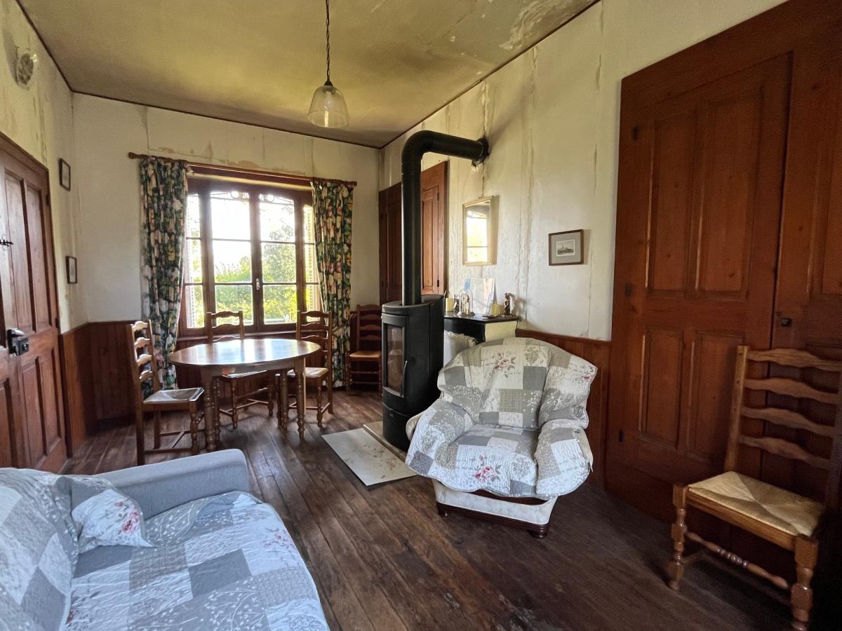 entrée, cuisine, véranda à la suite avec douche et wc, salon avec poêle à bois.