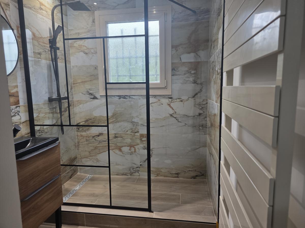 Entrée desservant , salon , cuisine équipée ouverte, 3 chambres, 1 salle de bain douche, WC indépendant, buanderie.