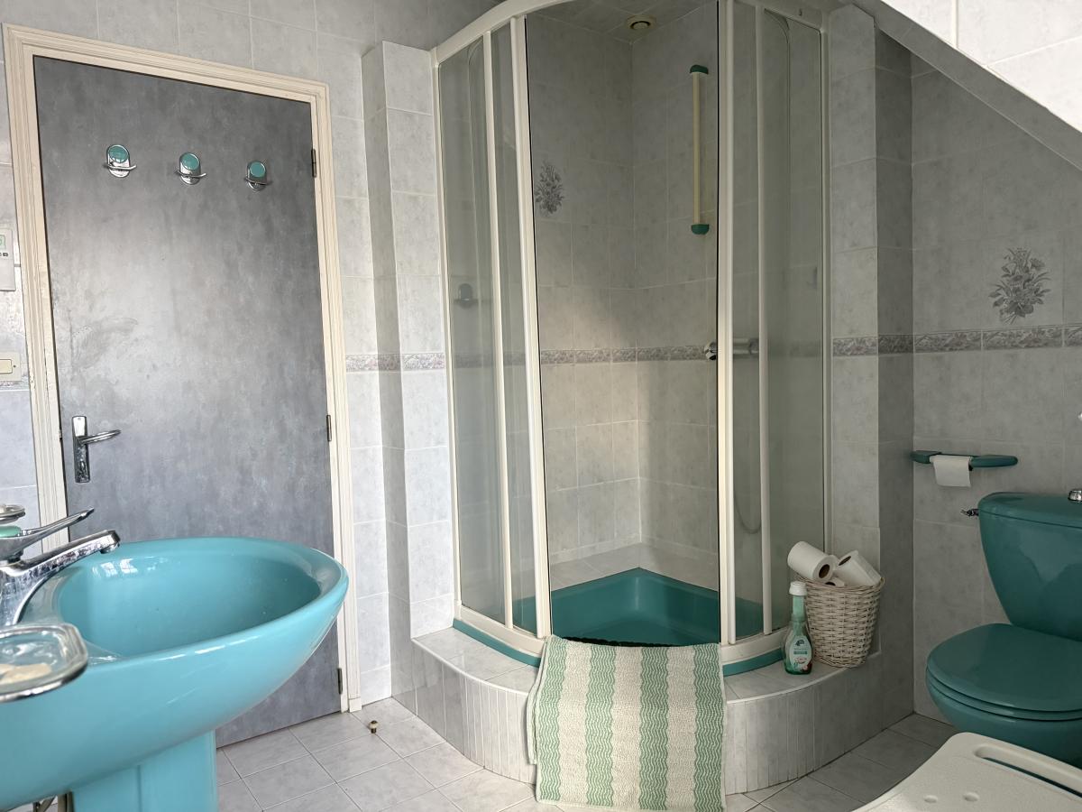 - A l'étage : deux chambres, chambre traversante avec placards, salle de bains avec WC, grande pièce d'environ 30 m2 à terminer.