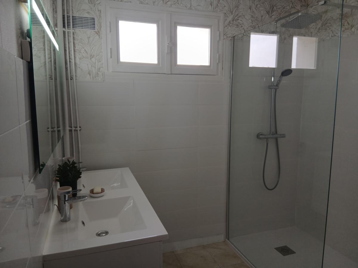 Le rez-de-chaussée surélevé se compose d'une entrée, d'une cuisine aménagée, d'un salon/séjour avec cheminée (insert), de toilettes, d'une salle d’eau (douche à l’Italienne et double vasque) et de deux chambres (avec placard/penderie).