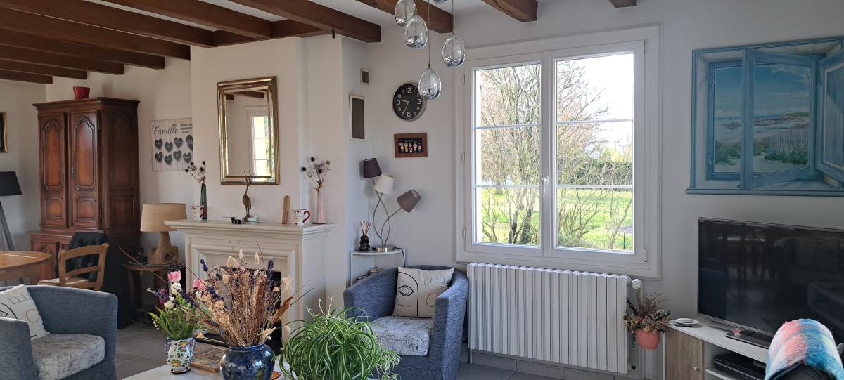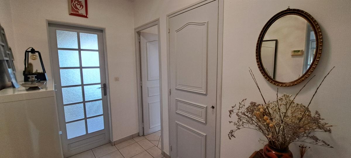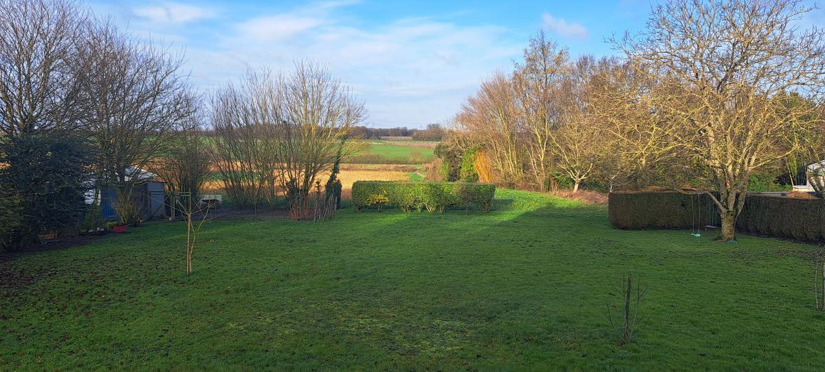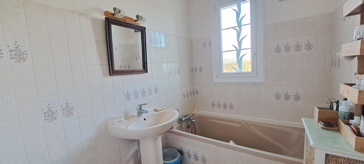Maison d'habitation avec sous-sol complet semi-enterré comprenant de plain-pied entrée, séjour salon avec cheminée, cuisine ouverte aménagée et équipée, terrasse, dégagement, wc, salle de bains, trois chambres, placards.