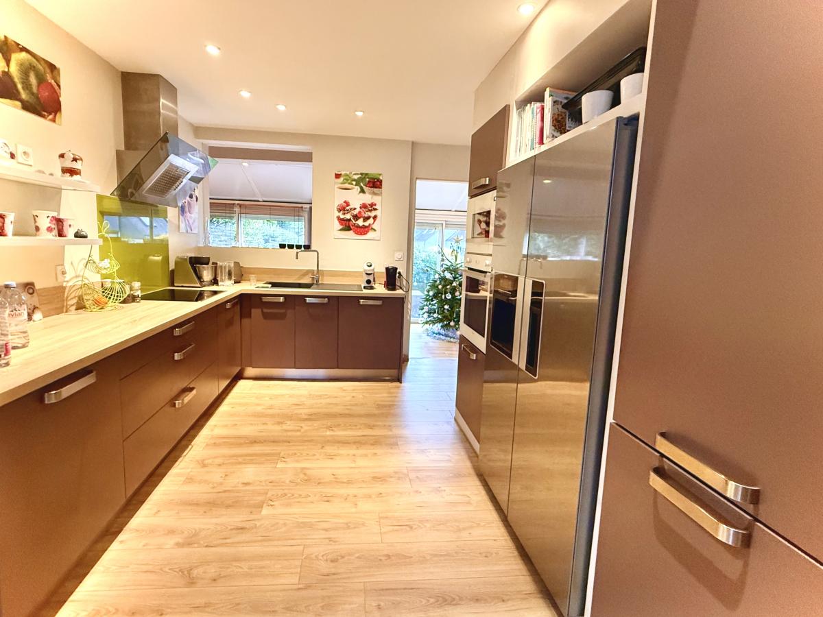 La cuisine est implantée au cœur de cet espace de vie très chaleureux, elle est entièrement aménagée et équipée. Elle communique avec le séjour et le coin repas.