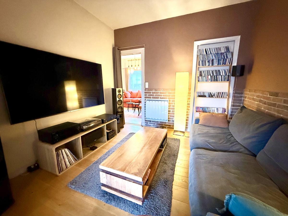 Nous avons un séjour, une salle à manger très lumineuse grâce à ses baies vitrées et un petit salon aménagé en espace TV.