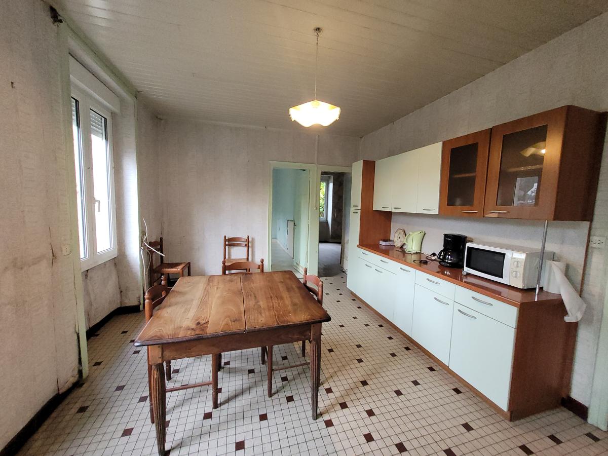 Dans un hameau tout proche des commerces de Pont-Scorff, Maison mitoyenne, en pierres, à rénover, d'env.130 m², comprenant, en l'état, au rdc : une entrée, un salon-séjour avec cheminée, une cuisine fermée, deux chambres, 1 salle de douches, et un wc indépendant.