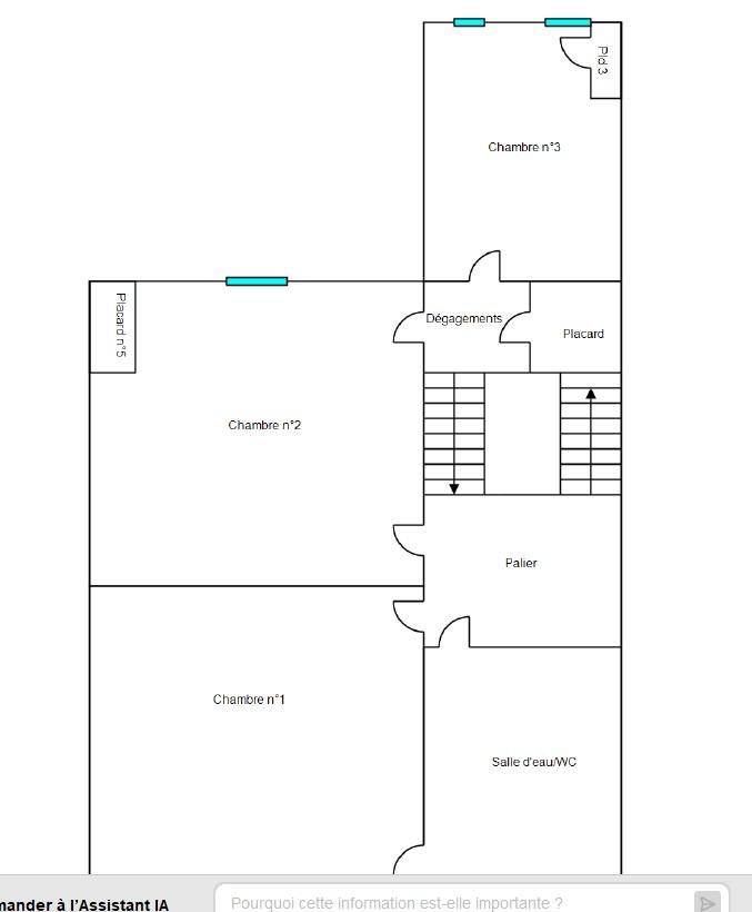 1er :Palier, Salle d’eau + fenêtre+ wc, , Chambre 1+ rangements + balcon/ rue, Chambre 2sur jardin avec dégagement + placard menant à Chambre 3 (au dessus cuisine)