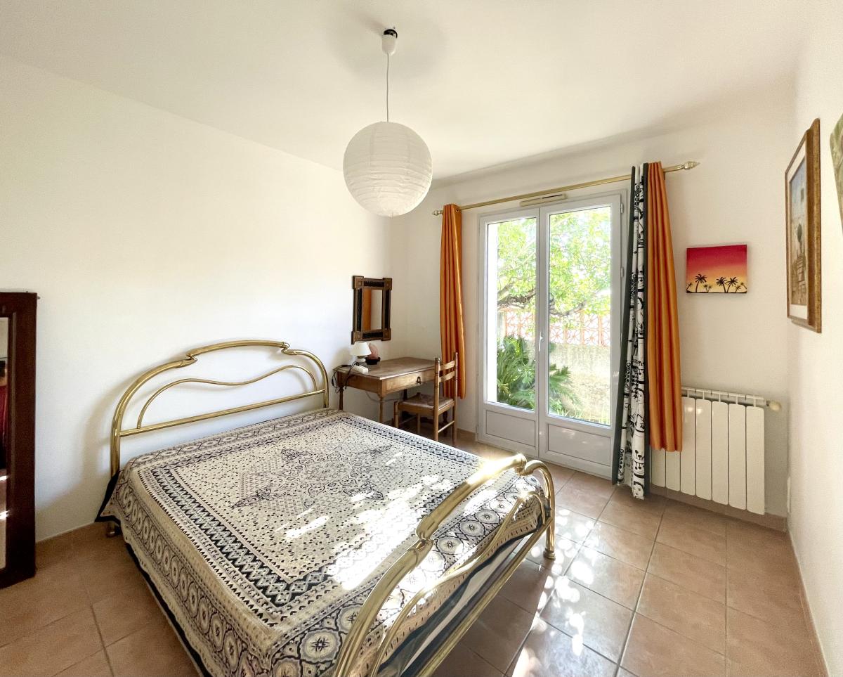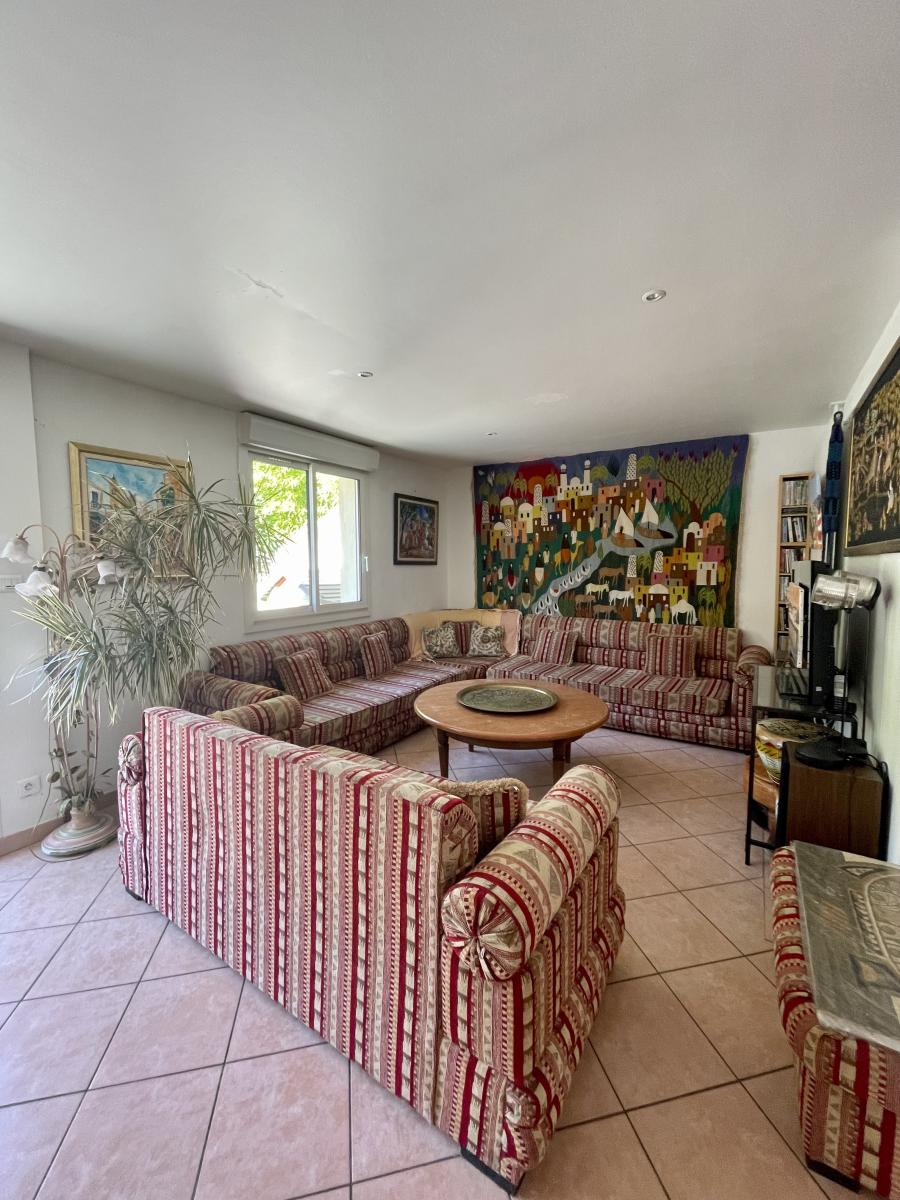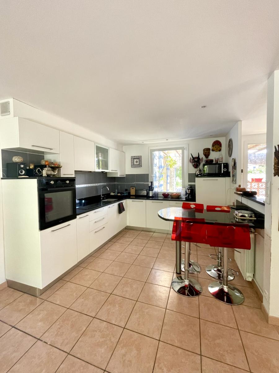 Dans un environnement calme à proximité du cœur du village, sur une parcelle de 1417 m², villa indépendante élevée d'un étage sur rez-de-chaussée comprenant entrée, séjour (salle à manger et salon) avec cuisine ouverte aménagée et équipée, deux chambres avec salle de bains et WC, puis dégagement avec partie technique, seconde partie nuit avec deux chambres une salle d'eau, un WC, et à l'étage une grande chambre avec un bureau. Chauffage central au gaz de ville; double vitrage (baie à galandage dans le séjour), chauffe eau solaire. Jardin arboré avec piscine et potager (forage); construction annexe (abri de jardin / atelier) et poulailler.