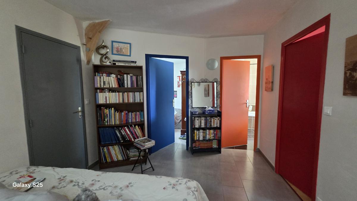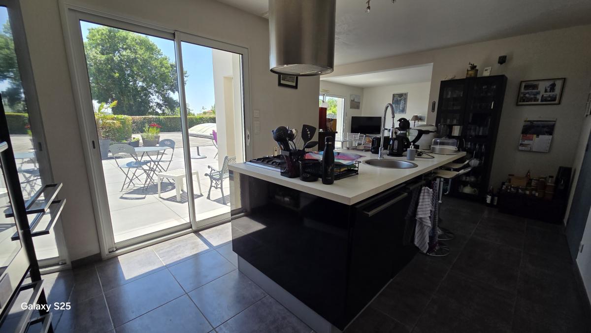 Une vaste entrée avec toit cathédrale, grand séjour lumineux avec cuisine aménagée équipée donnant accès à la terrasse, arrière cuisine, bureau et WC.