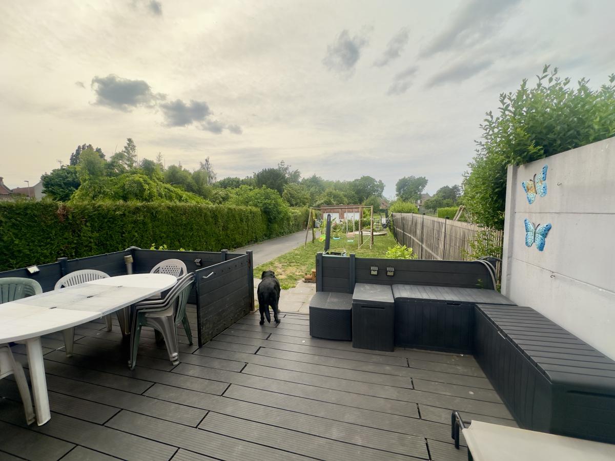 Terrasse jardin et passage voiture sur le côté donnant accès au garage.