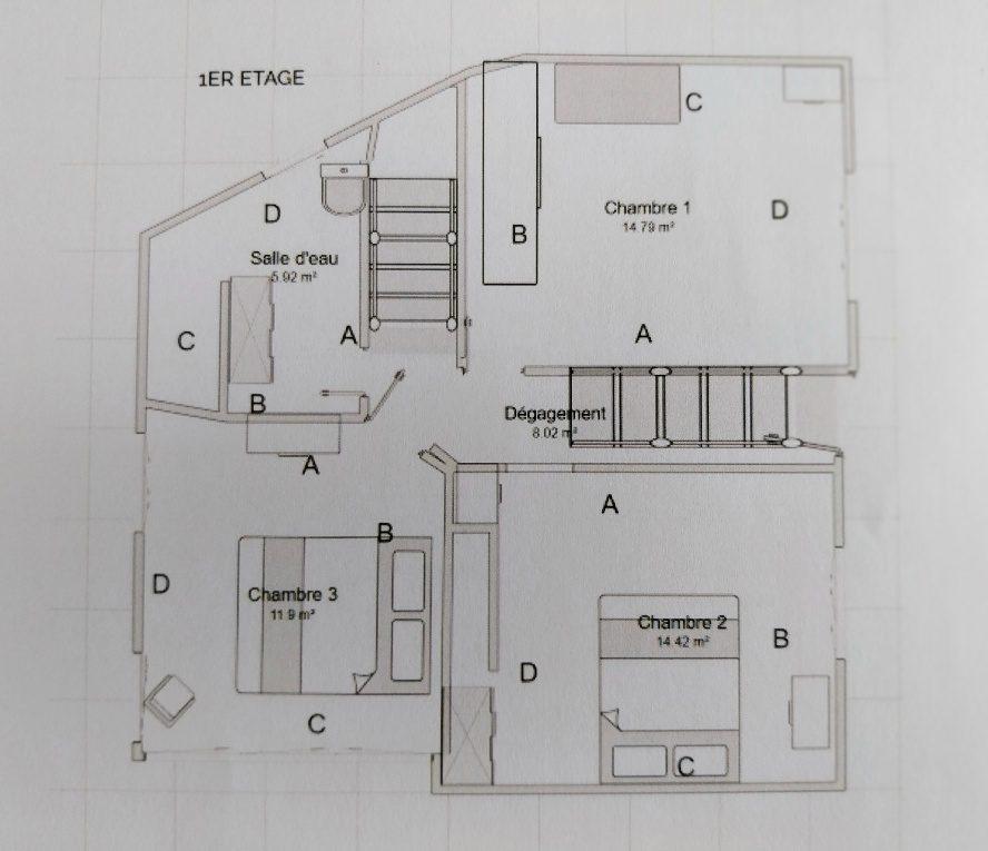 Au 1er étage : 3 grandes chambres, salle de douche, wc.