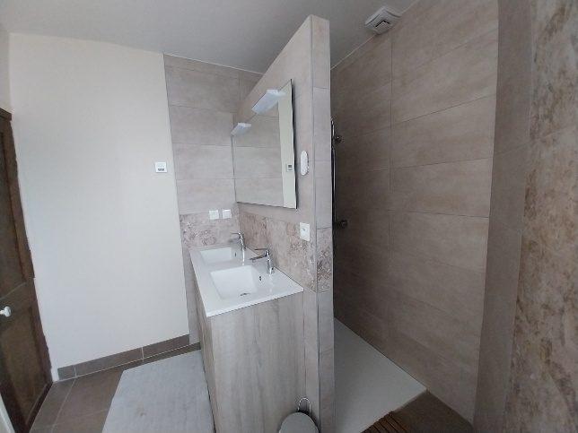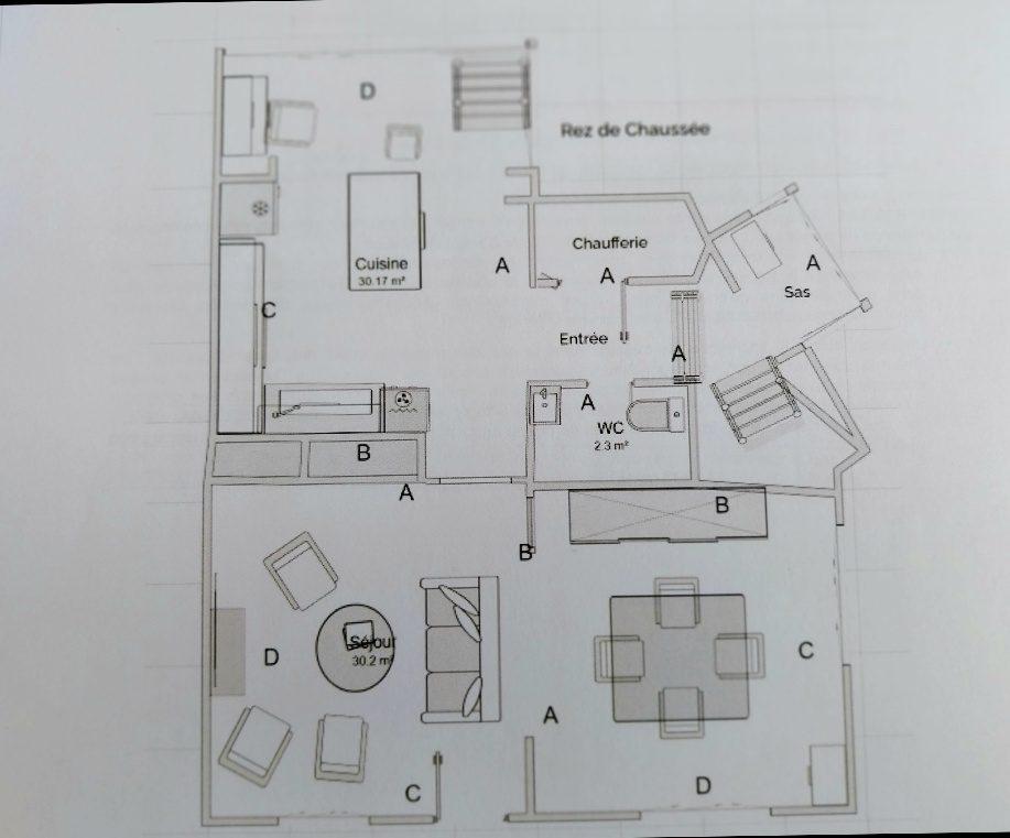 La Maison comprend au RDC : une Entrée abritée, une cuisine aménagée et équipée vitrée donnant sur la terrasse, salle salon de 30 m² avec poêle à granulés, wc.
