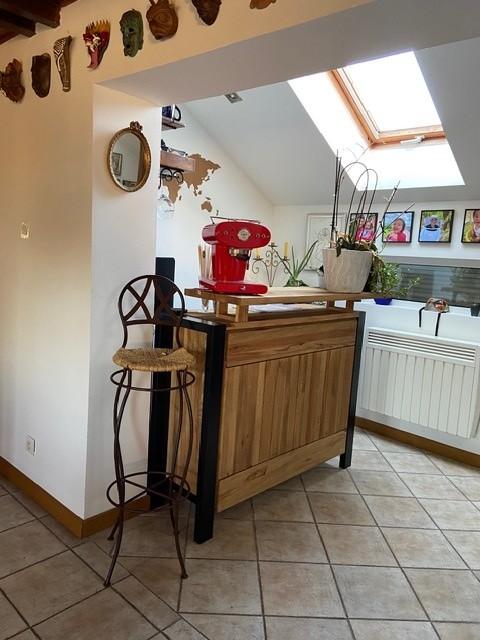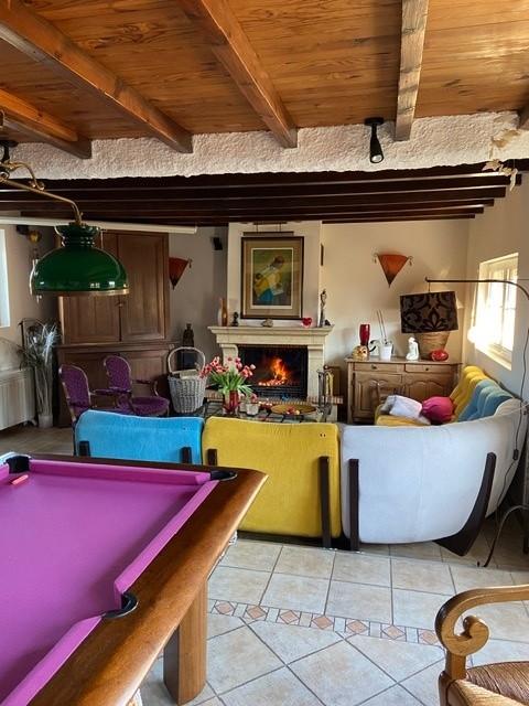 Dès l’entrée, les volumes et la luminosité séduisent. La pièce de réception d’environ 50 m², chaleureuse et sophistiquée, est sublimée par une cheminée avec insert et un poêle à granulés, créant une atmosphère feutrée et conviviale.