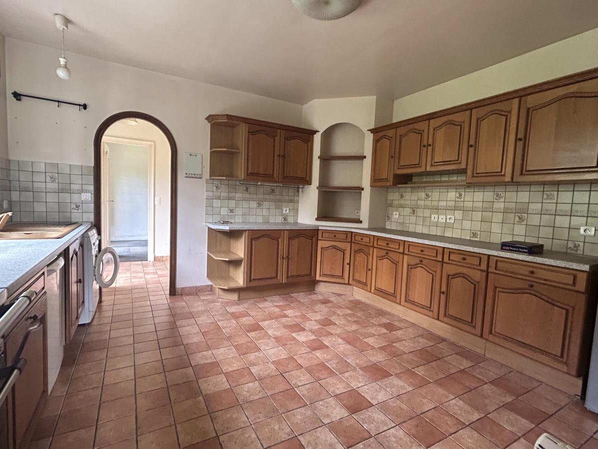Rez de chaussée : bureau/chambre avec dégagement, entrée, wc, grande cuisine, salon avec cheminée, salle à manger avec cheminée.