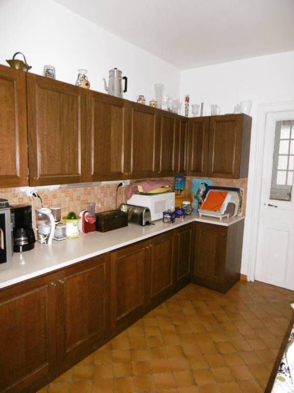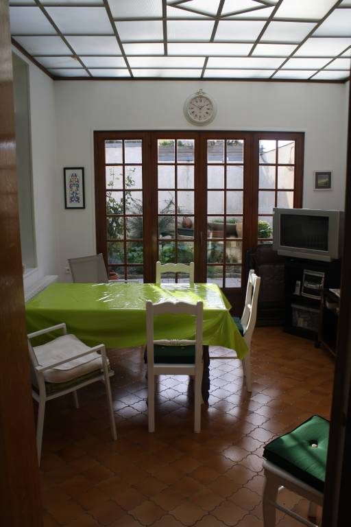 Au rez-de-chaussée : entrée avec moulures et soubassement, salon-séjour parquet, pièce repas sous véranda avec insert, cuisine.