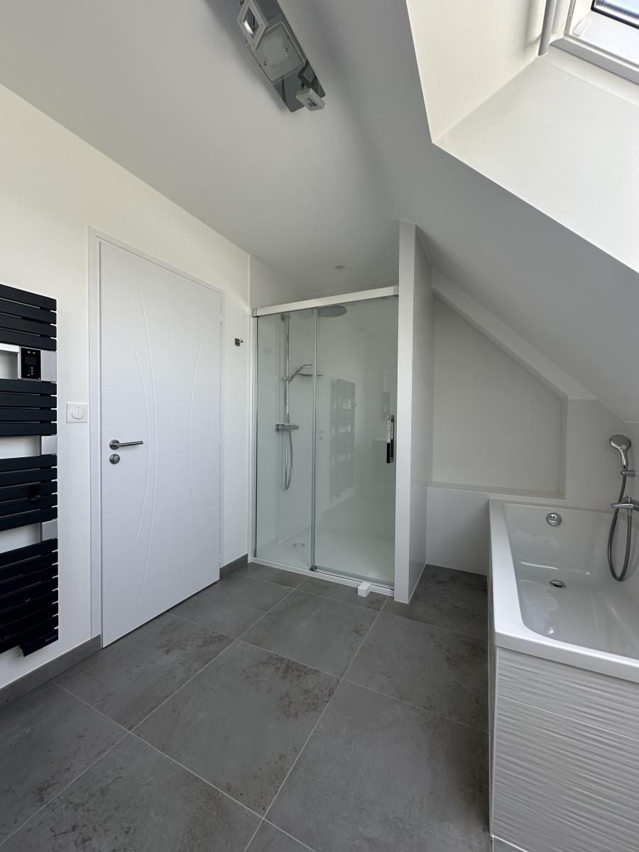 Une salle de bains contemporaine ainsi qu’un WC indépendant .