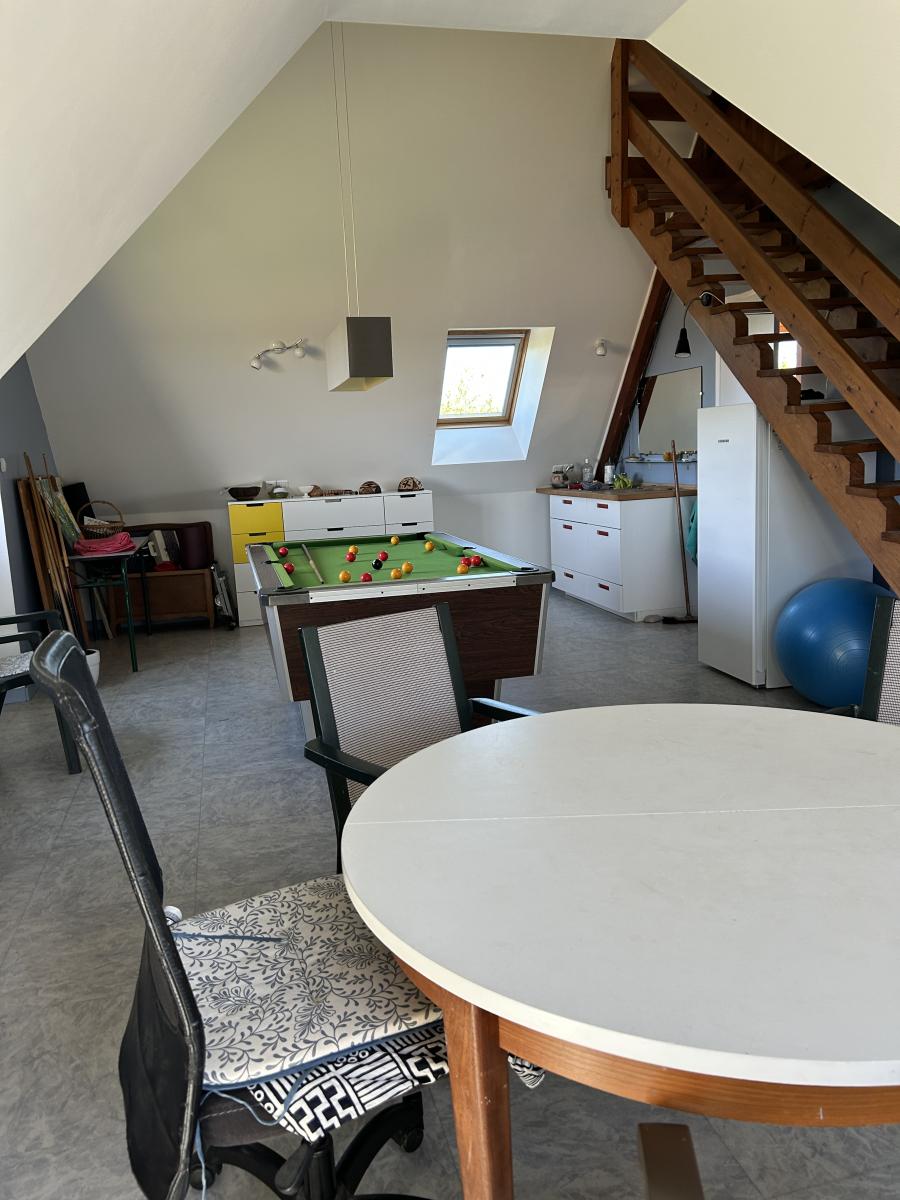 - A l'étage : palier, salle de jeux avec un coin cuisine, salle d'eau avec wc, bureau, deux chambres.