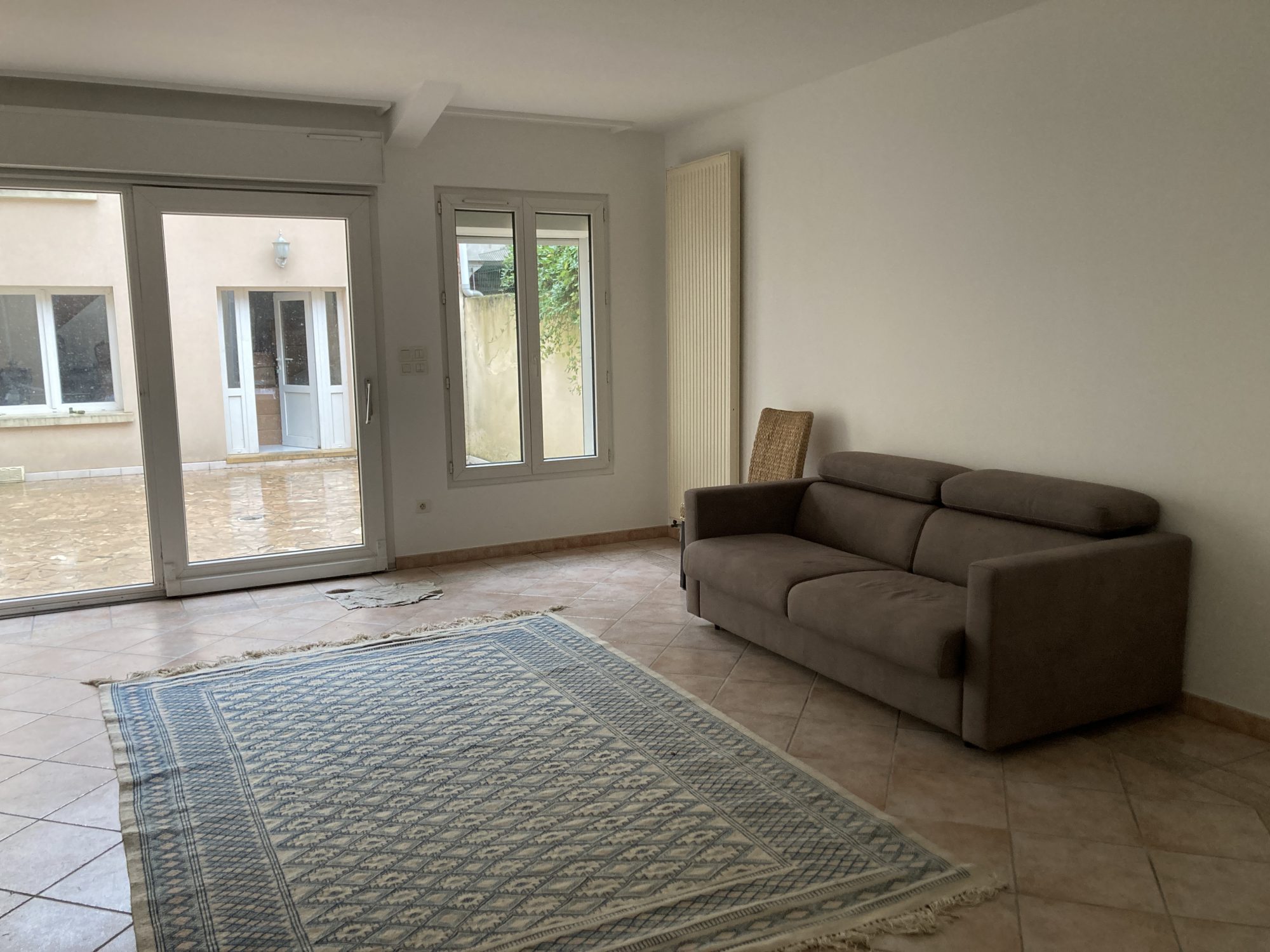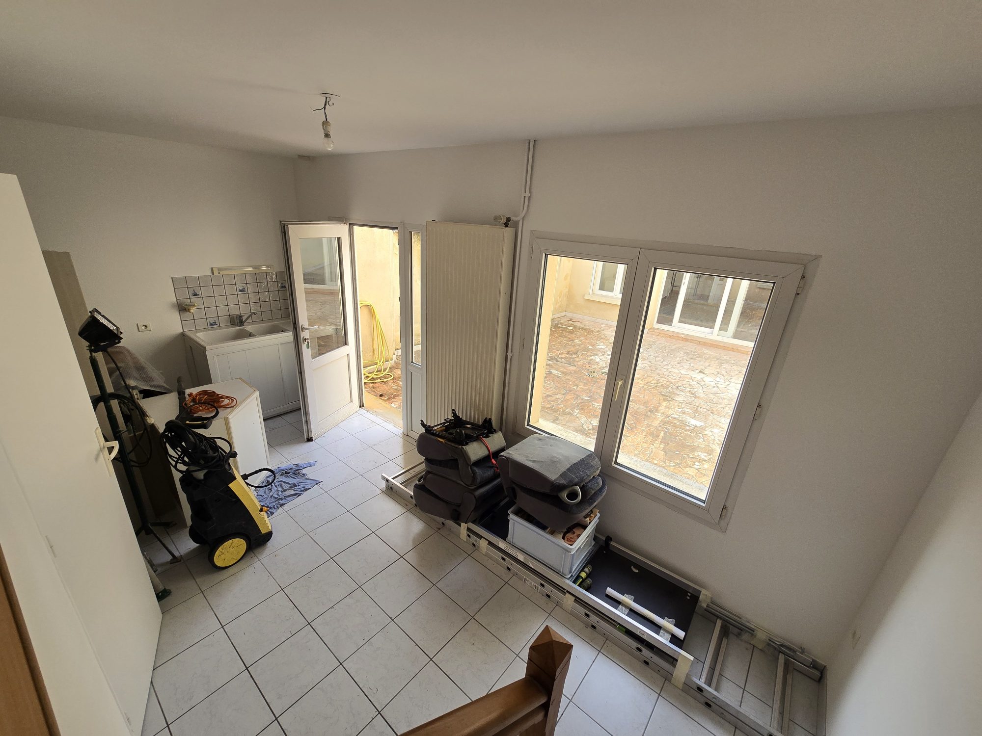 La maison comprend une entrée, salon ou bureau, cuisine équipée, grand séjour sur cour, salle d'eau avec wc au rez-de-chaussée.