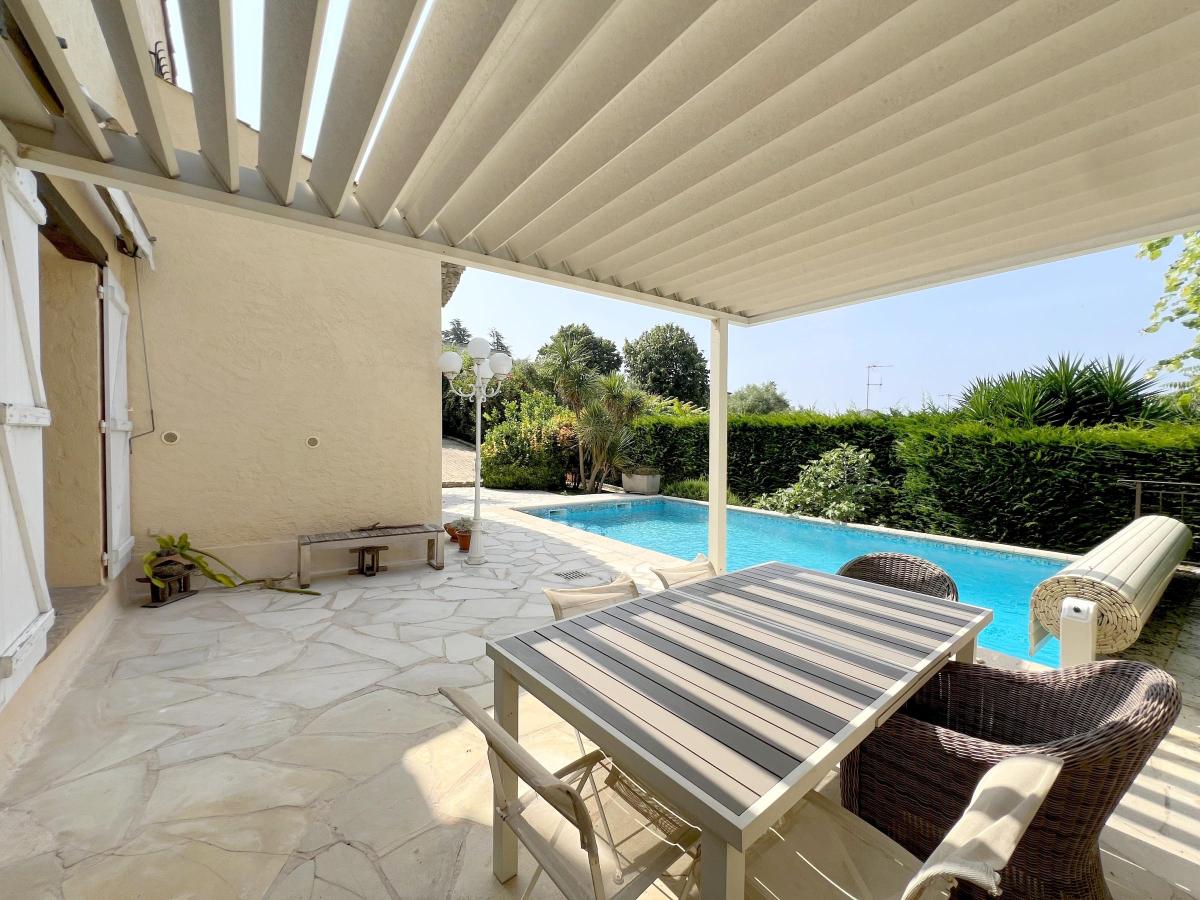 Les extérieurs offrent deux terrasses, un jardin soigné et une piscine avec store de protection automatique.