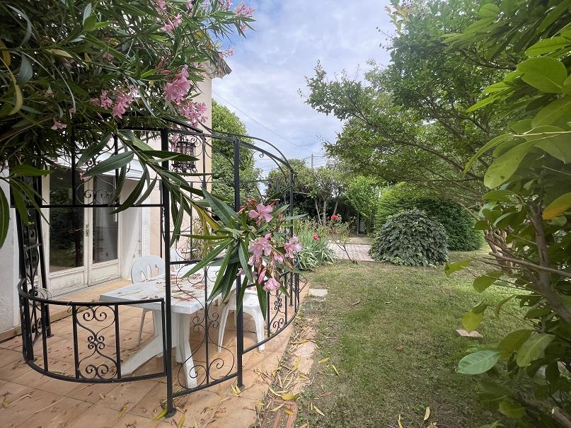Agréable jardin arboré avec forage d'environ 1005m² et terrasse plein Sud pour profiter des beaux jours.