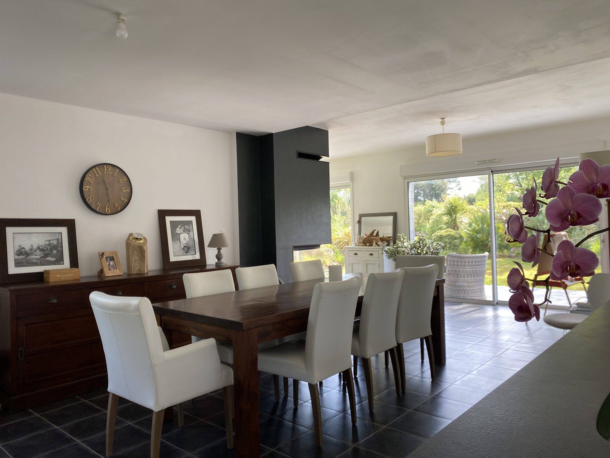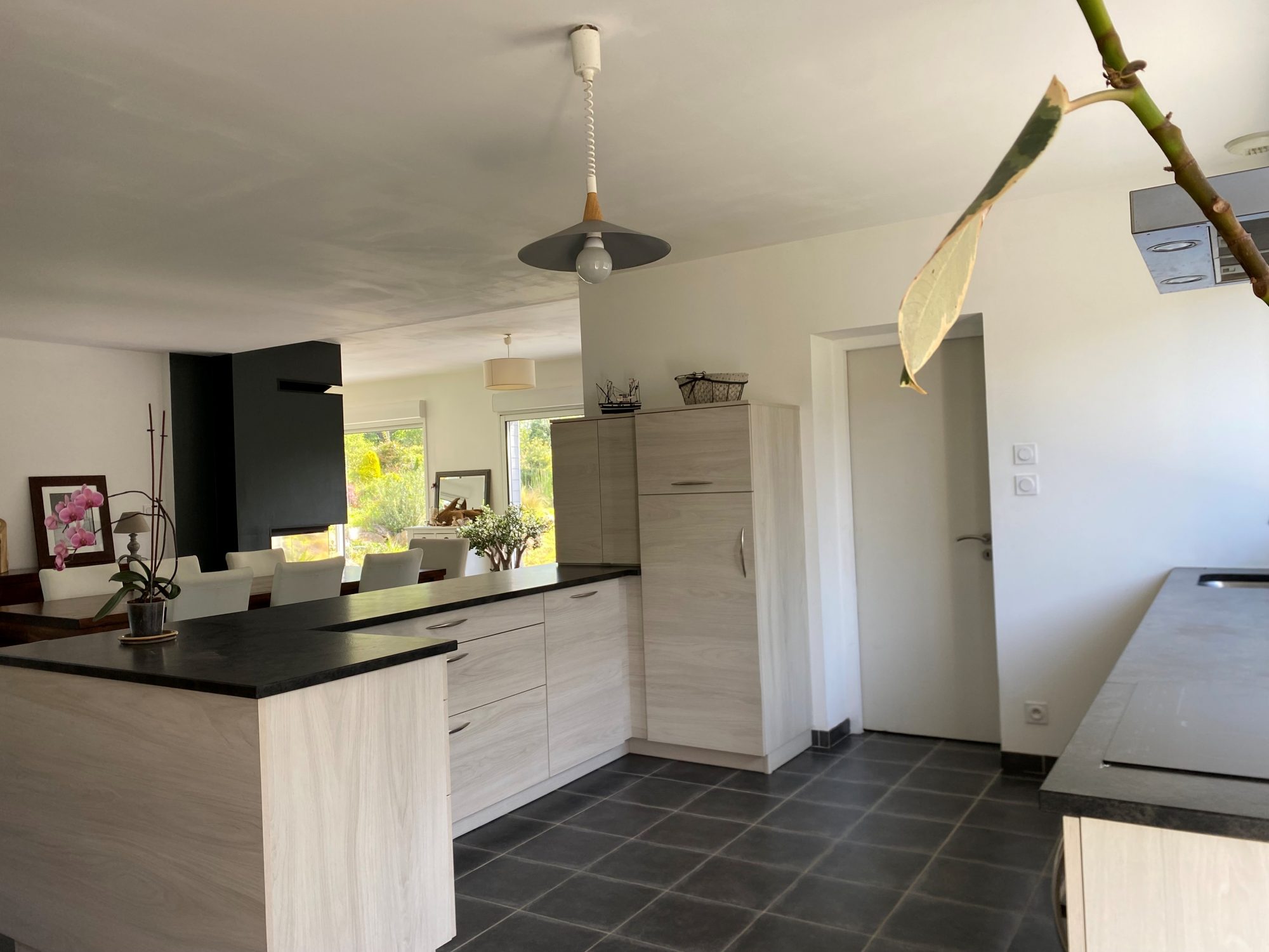 Vaste pièce de vie de 76 m² : un salon-séjour avec cheminée, ouvert sur une cuisine équipée moderne.