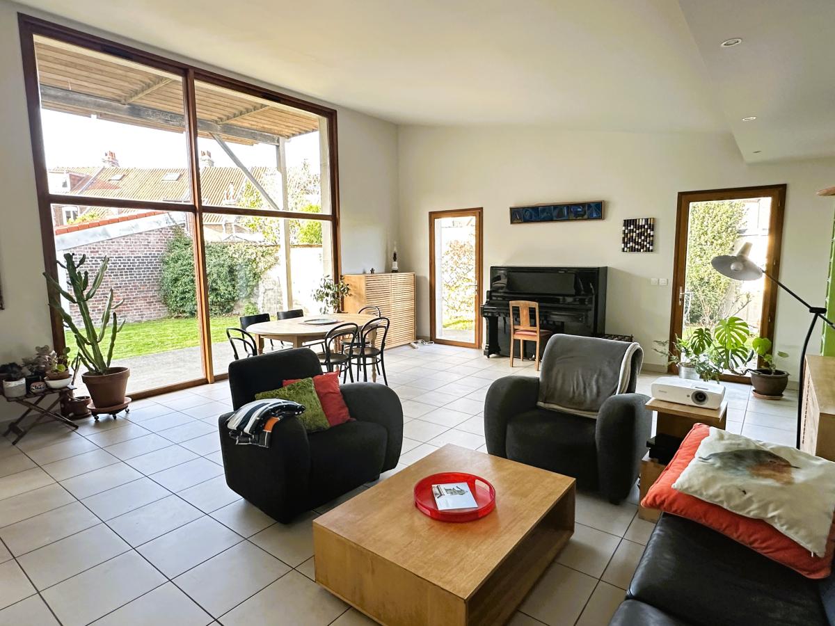 MARCQ EN BAROEUL. Entre St Maur et Le Buisson, à 500 m du tramway. Maison 1930 semi-individuelle d'environ 185 m² habitables (dont une extension d'environ 80 m² réalisée au début des années 2000), construite sur 3 parcelles cadastrées pour une contenance globale de 592 m². Au rdc se situe une pièce de vie lumineuse de 40 m² donnant sur un jardin d'environ 250 m² orienté sud-ouest (une autre parcelle de jardin de 170 m² se trouve sur l'arrière de la maison donnant sur une autre rue), une cuisine séparée et aménagée d'environ 18 m², une entrée avec placard, une buanderie, une SDD, des WC indépendants et un espace de 30 m² (ancien cabinet médical) offrant différentes possibilités (actuellement espace bureau + chambre + WC); au 1er étage un palier distribue 2 chambres (12 et 20 m²) dont une avec sa SDD; au 2ème étage se trouvent 2 chambres (12 et 19 m²) et un accès aux combles aménageables ( 20 m² habitables). Ccgaz. Grand garage de 35 m². Cave. Prévoir quelques rafraichissements.