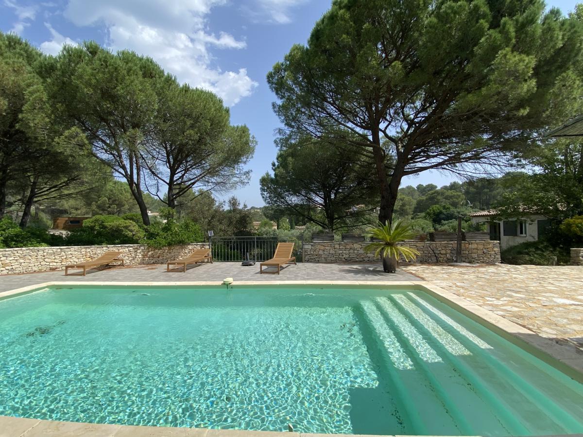 Nîmes collines route d'Uzès : Villa de 190 m² environ, composée d'un séjour de 50 m² avec poêle à bois, une cuisine semi-ouverte, 4 chambres (dont une suite avec sa salle d'eau), une salle de bains, 2 WC indépendants ainsi qu'un appartement T2 comprenant séjour avec cuisine équipée neuve, une chambre, une salle d'eau avec WC, avec entrée indépendante en rez-de-jardin et communiquant avec la maison. Le tout sur 3000 m² de terrain clos avec piscine (chauffée) 9*4.5m, terrasses, arrosage automatique, abri voiture, et pompe à chaleur avec système rafraîchissant par le sol.
