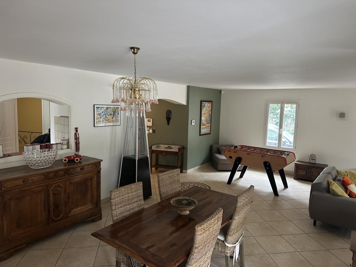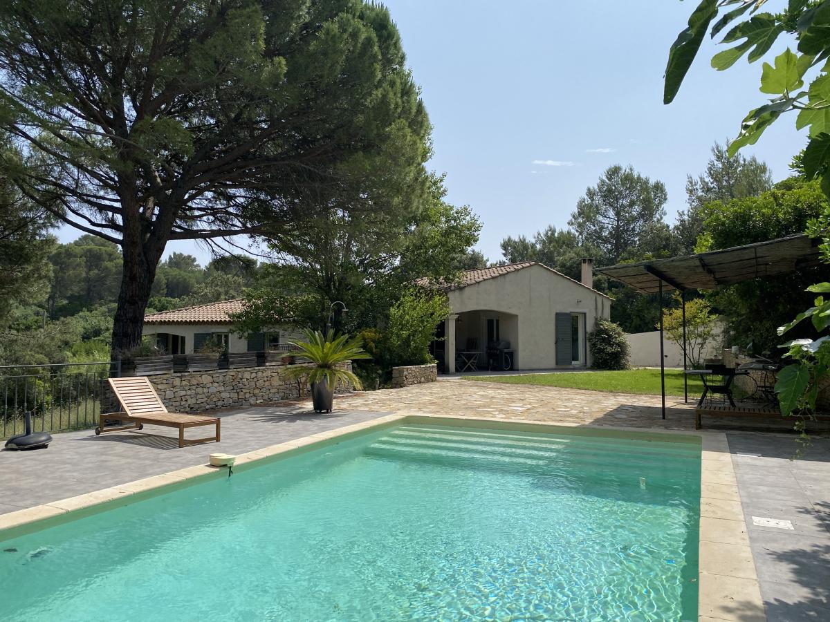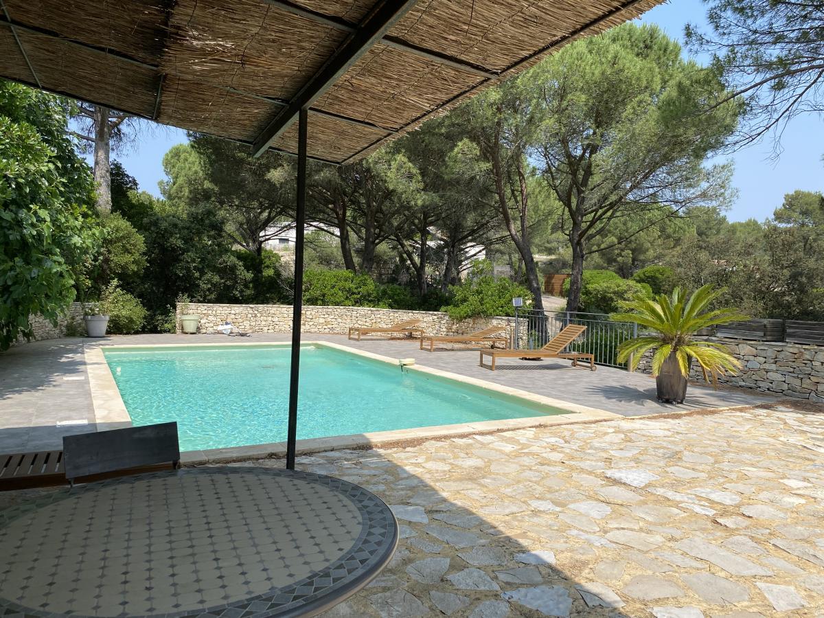 Nîmes collines route d'Uzès : Villa de 190 m² environ, composée d'un séjour de 50 m² avec poêle à bois, une cuisine semi-ouverte, 4 chambres (dont une suite avec sa salle d'eau), une salle de bains, 2 WC indépendants ainsi qu'un appartement T2 comprenant séjour avec cuisine équipée neuve, une chambre, une salle d'eau avec WC, avec entrée indépendante en rez-de-jardin et communiquant avec la maison. Le tout sur 3000 m² de terrain clos avec piscine (chauffée) 9*4.5m, terrasses, arrosage automatique, abri voiture, et pompe à chaleur avec système rafraîchissant par le sol.