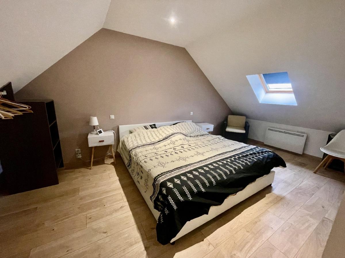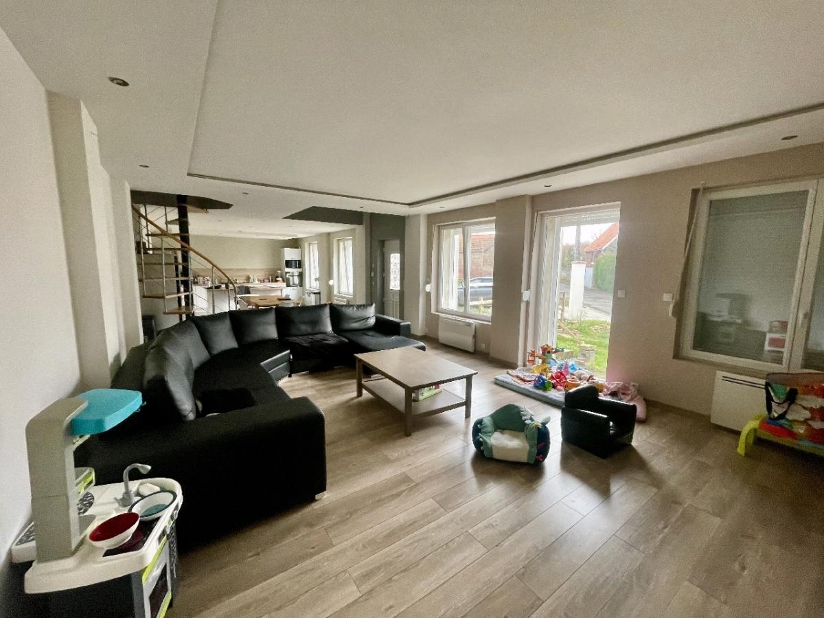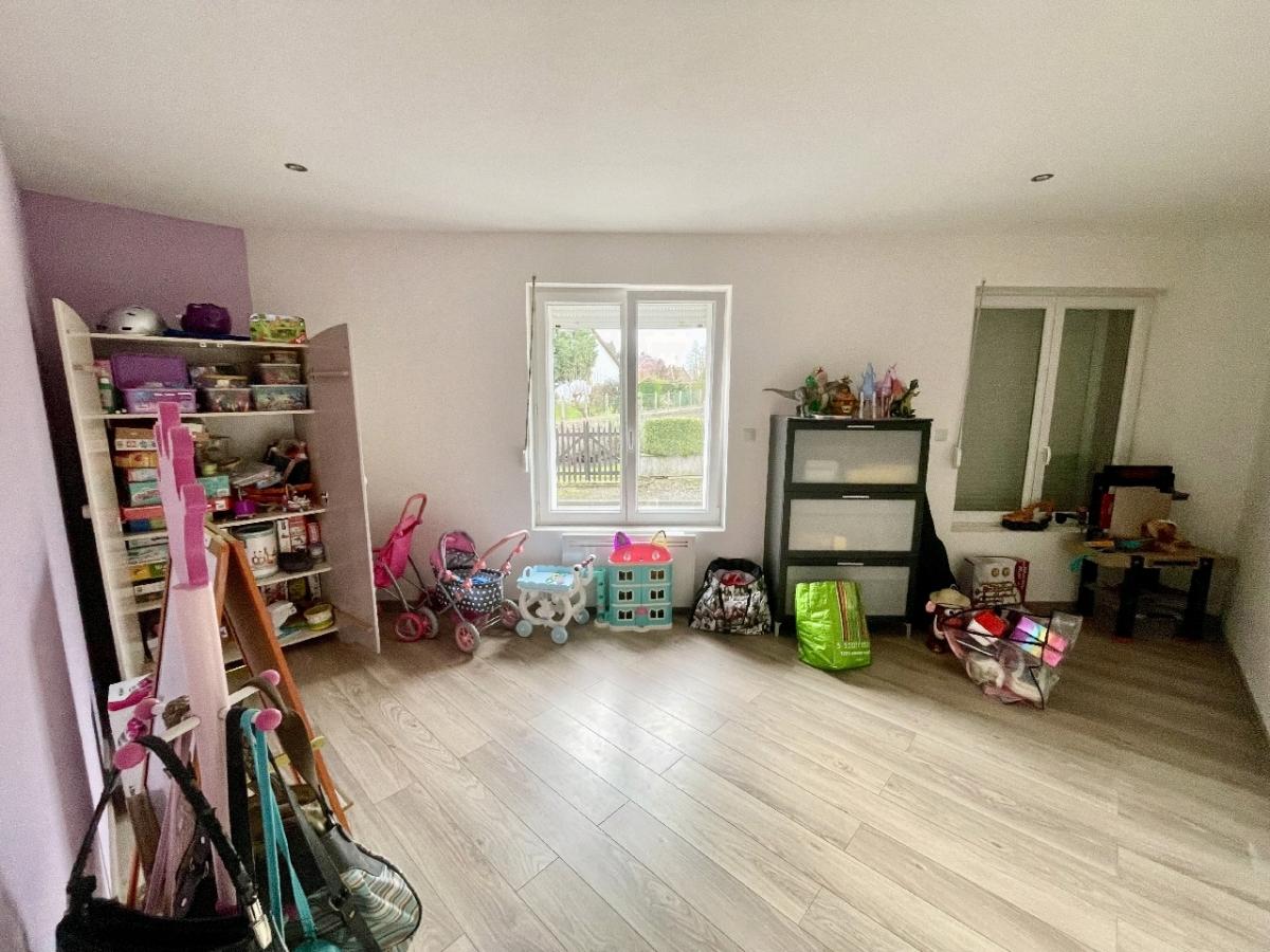 Maison individuelle d'une superficie de 193 m² habitable comprenant entrée, grand salon/séjour avec poêle à granulés, cuisine équipée, deux chambres, salle de bains, wc, chaufferie.