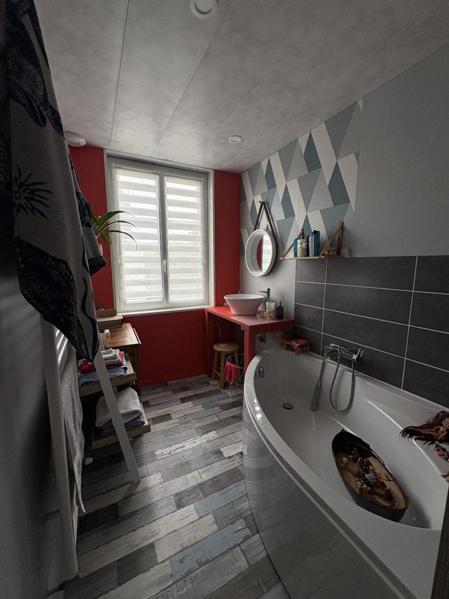 Une maison entièrement rénovée comprenant au rez-de-chaussée : une entrée, un salon avec placards, une cuisine aménagée et équipée, une salle à manger, une salle de douche et une chaufferie.