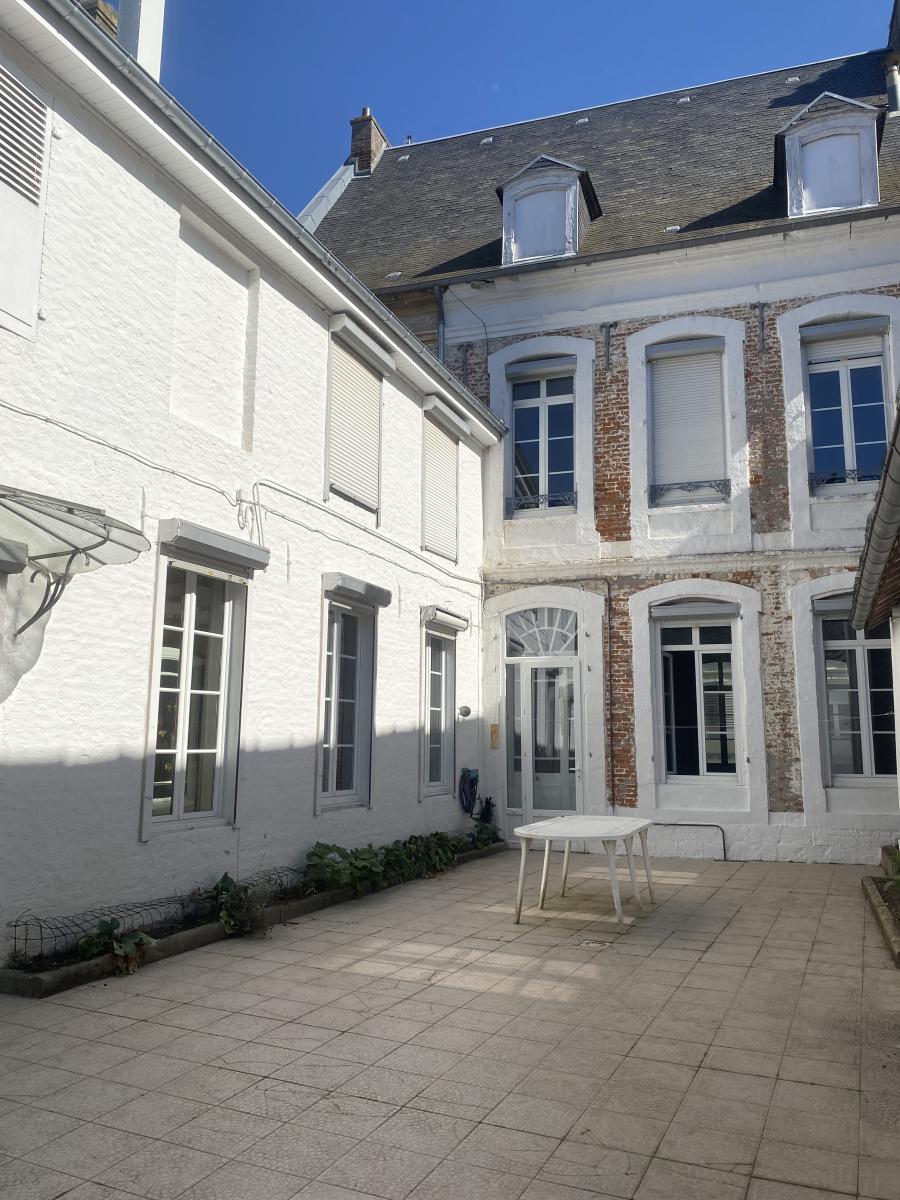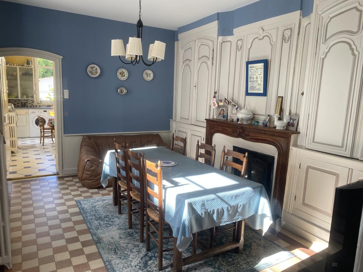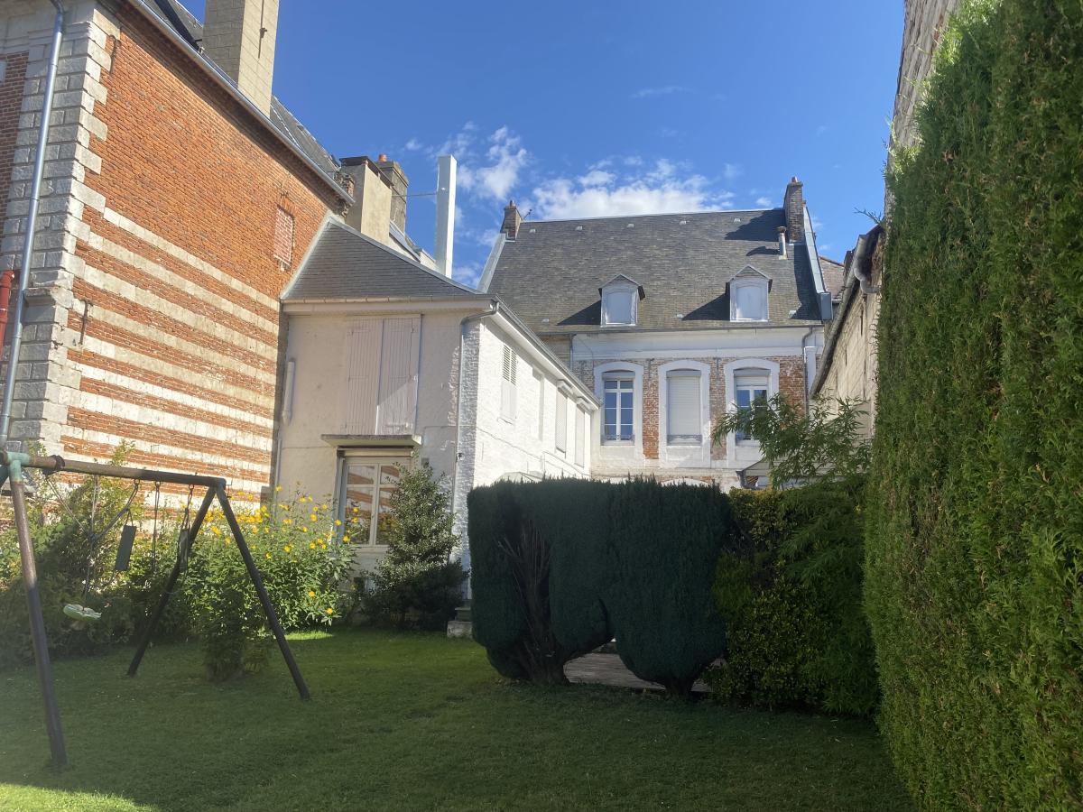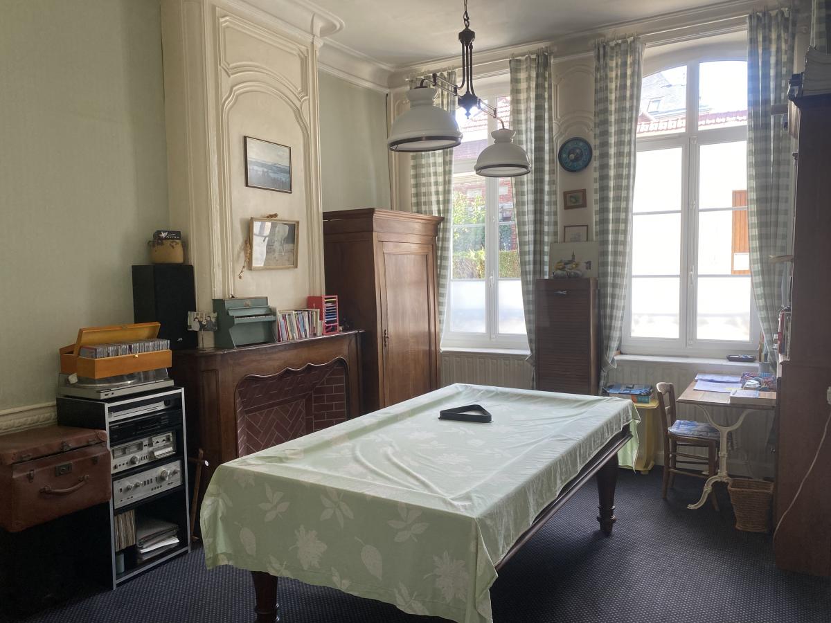 Maison de caractère à DOULLENS centre-ville sur 626m² avec double garage (5 voitures) (200m² hab) entrée, séjour-salon (38m²), séjour (17m²), salle de billard (16m²), cuisine (15m²) et WC. Etage : 5 chambres, salle d'eau, salle de bains, WC et grenier au dessus. Chauffage central gaz de ville (chaudière 2024), atelier-dépendance, terrasse, jardin.