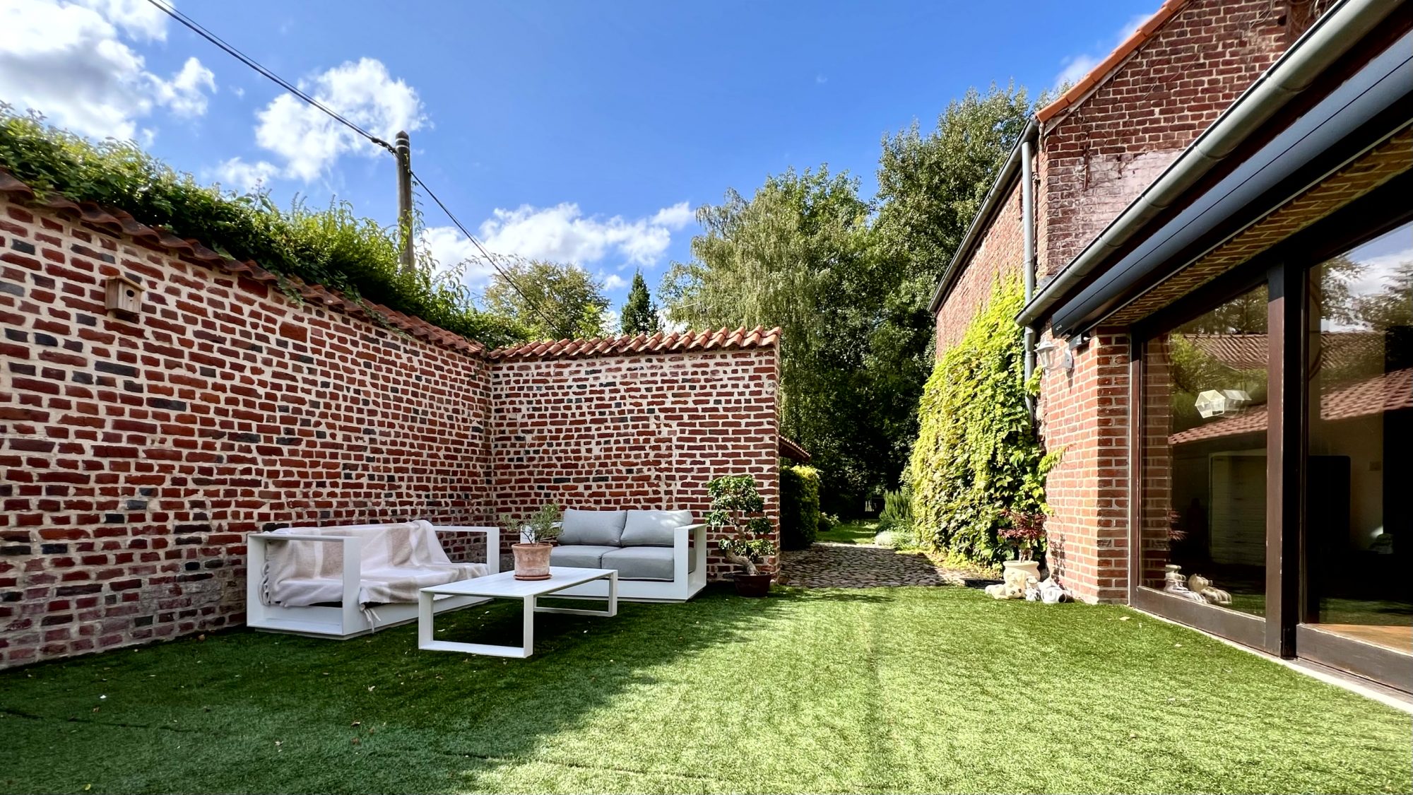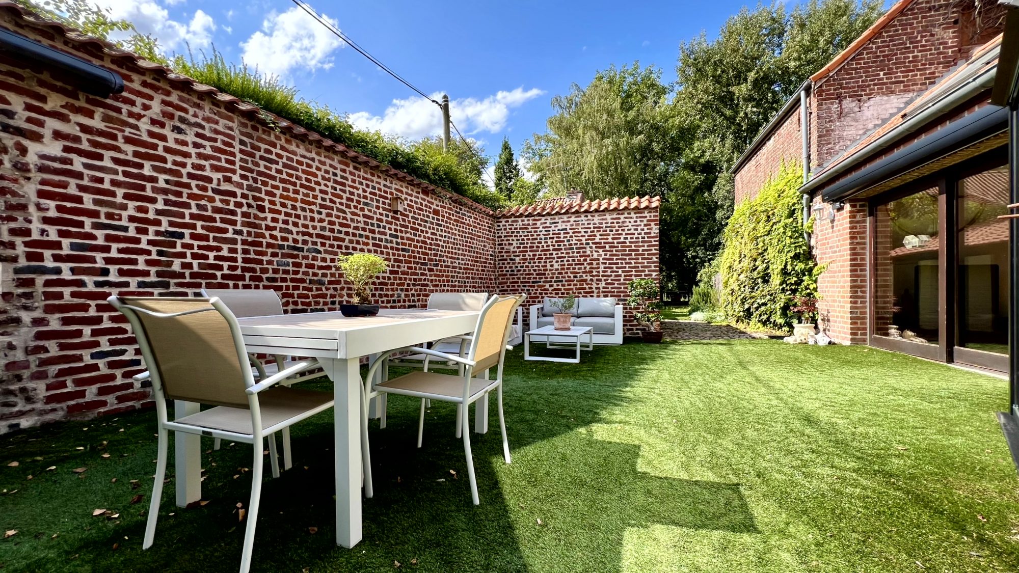 L'extérieur jouit d'une grande terrasse avec dans le prolongement une vue sur le jardin verdoyant.