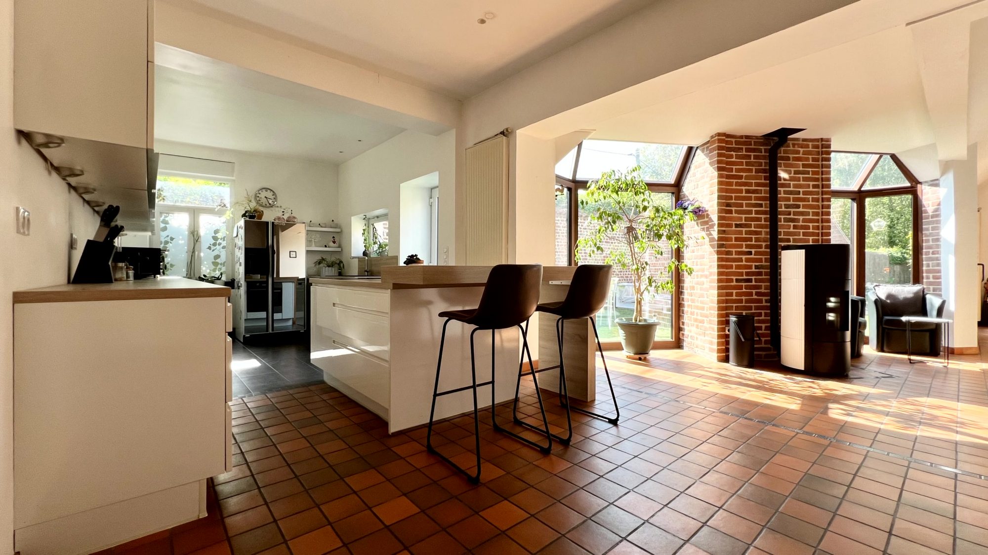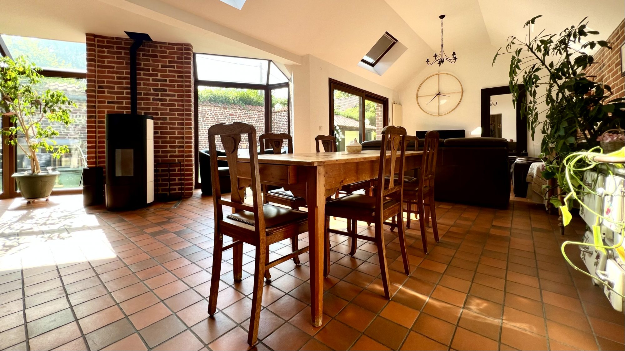 Les matériaux d'origine, tels que les tomettes et la brique, sont sublimés par de grandes baies vitrées et bow-window qui offrent une vue sur la terrasse. Le poêle à pellets, véritable point central, crée un lien convivial entre les différentes pièces.