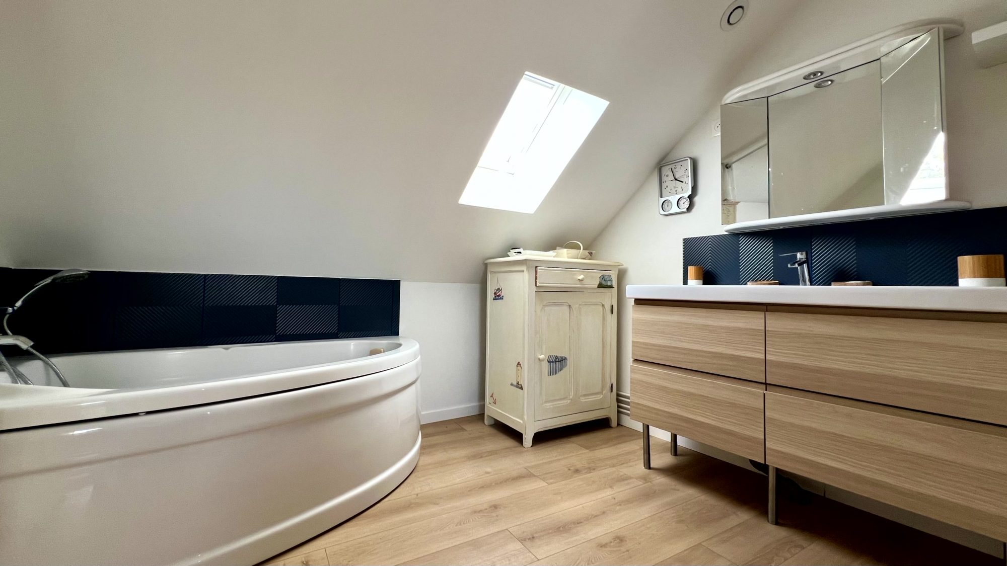 A l'étage un palier dessert une seconde suite parentale avec salle de bain ouverte et dressing.