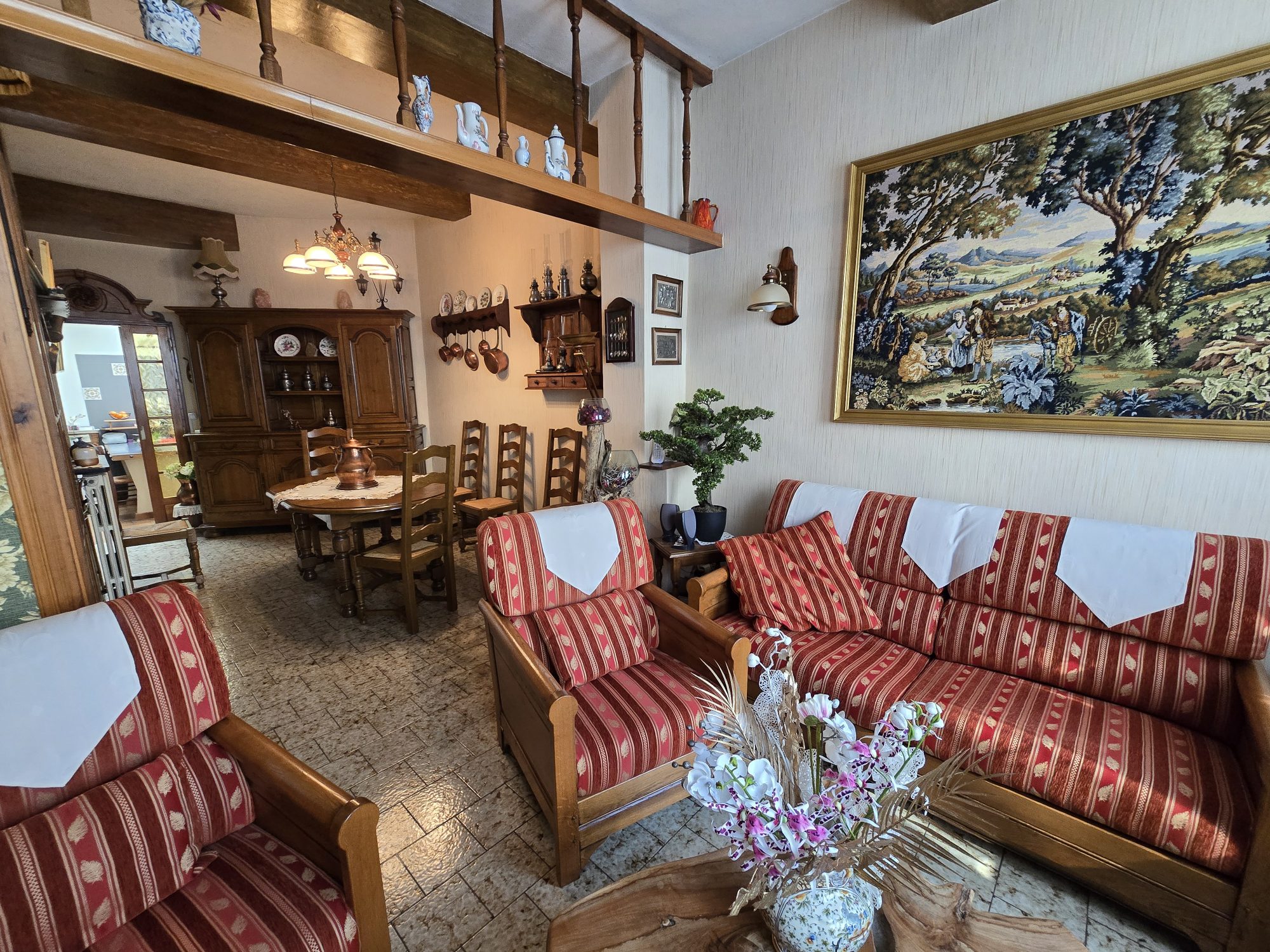 Maison d'habitaiton : couloir d'entrée, salon-séjour, cuisine équipée, véranda, salle de bains, wc au rez-de-chaussée.