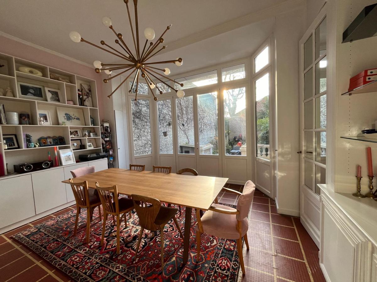 Développant 214m² habitables, le hall d'entrée ouvre sur une pièce de vie de plus de 60m² avec cheminée feu de bois, la salle à manger avec un bow-window rénové et la cuisine équipée toute neuve, l'ensemble donnant sur la terrasse et le jardin d'environ 100m² exposé Sud Ouest. Un bureau prend également place au rez de chaussée sur la façade avant.