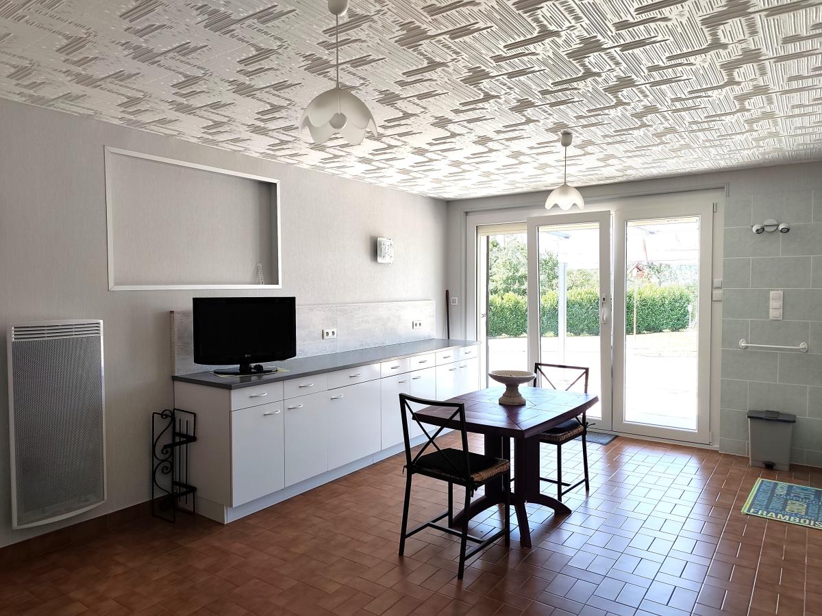 Au niveau supérieur une pièce à vivre baignée de lumière de 54m² avec cuisine ouverte, poêle à granules, trois chambres dont deux avec placards, une salle d'eau, un wc séparé.